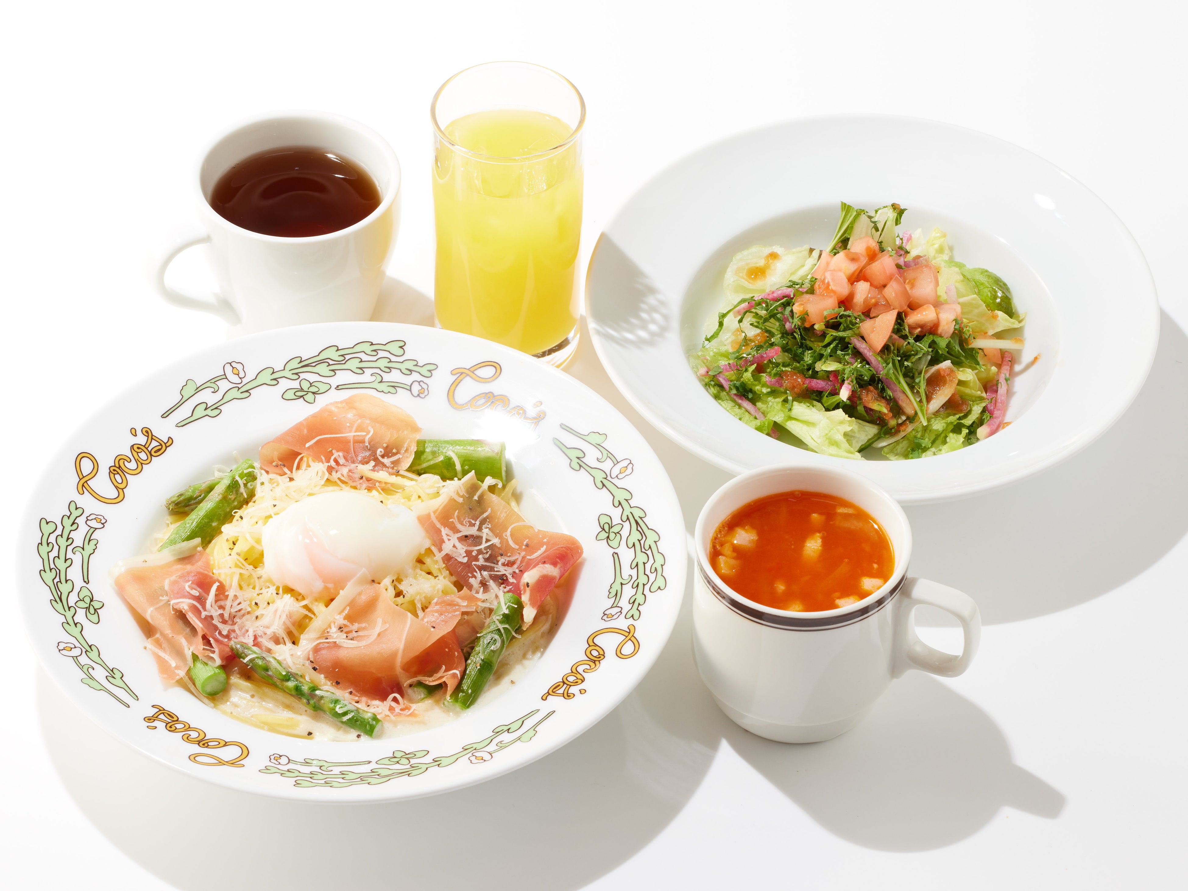 しっかりと熟成した旨みたっぷりの“ハモンセラーノ”とみずみずしいアスパラを使用した「熟成生ハムとアスパラのカルボナーラ」は、芳醇な香りのトリュフオイルをかけることで風味豊かに仕上げました。程よい塩味の“ハモンセラーノ”と甘みのあるアスパラは相性抜群。コクのあるグラナパダーノチーズやまろやかな半熟卵がカルボナーラをより濃厚な味わいに変化させます。ふわりと香るトリュフオイルと旨みたっぷりの“ハモンセラーノ”が織りなす魅惑のカルボナーラをご堪能ください。あわせて「熟成生ハムとアスパラのカルボナーラ」とグリーンサラダ、ドリンクバー・スープバーがセットになった「5月のグルメお得コース」も登場します。単品でご注文いただくよりも90円お得です。