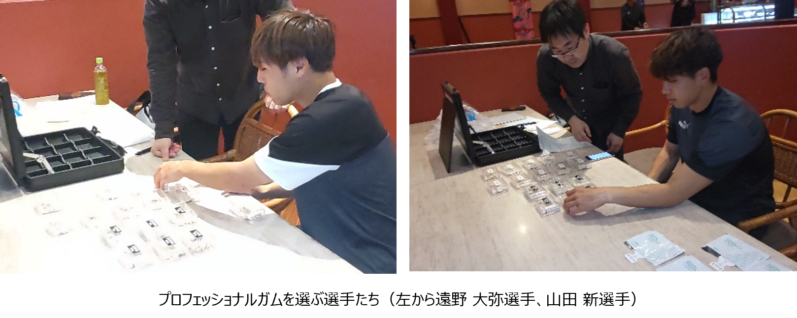 武田友孝客員教授監修のもと、選手自らが自分自身にあった形状・硬さ・香味を選び製作される、選手オーダーメイドのガムです。提供されるガムは、噛んでいる間の硬さの変化が少ない特別な設計となっているのが特徴で、アスリートのパフォーマンス発揮のサポートとなることを目指し開発されています。一般的なガムは、噛んでいくにつれて、硬さが大きく変化するのに比べ、しっかりとした噛み応えが続くため、噛むことのトレーニングに適しています。