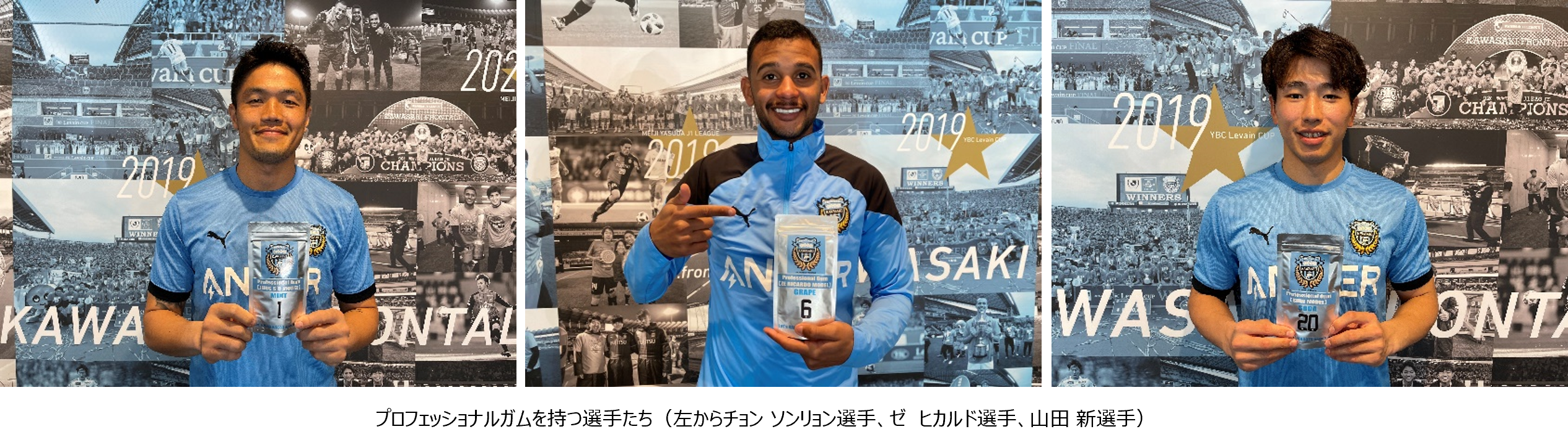 今年で3回目となる川崎フロンターレへのプロフェッショナルガムの提供。今年は、チョン ソンリョン選手・ゼ ヒカルド選手・遠野 大弥選手・山田 新選手・山本 悠樹選手の計5選手へプロフェッショナルガムを提供いたします。今回初めて提供を受ける山田選手は「ガムを噛むことによるリラックス効果に期待したいです」とコメント。遠野選手は、「ガムは噛むことは集中力につながると昔から言われてきたので、集中できるように噛み続けています」と話しました。山本選手は、60通りのガムの組み合わせから、形状は粒・固さはソフトとミドルの中間・味はライムミントを選びました。「固すぎても良くないし、柔らかいと物足りなく感じるので、ちょうど良い固さにしました。ガムはあまり甘すぎず、味が長く続くものが好みです」とコメント。「自分専用のガムを作ってもらえる機会は貴重なので、ガムを噛んでリラックスしたいです」とプロフェッショナルガムへの期待を寄せていただきました。ヒカルド選手は、「ガムを噛むことでリラックスやリフレッシュができることに期待しています」とコメント。サポーターの皆さんに向けて「一緒にタイトルを取りましょう」と今シーズンへの意気込みを語っていただきました。