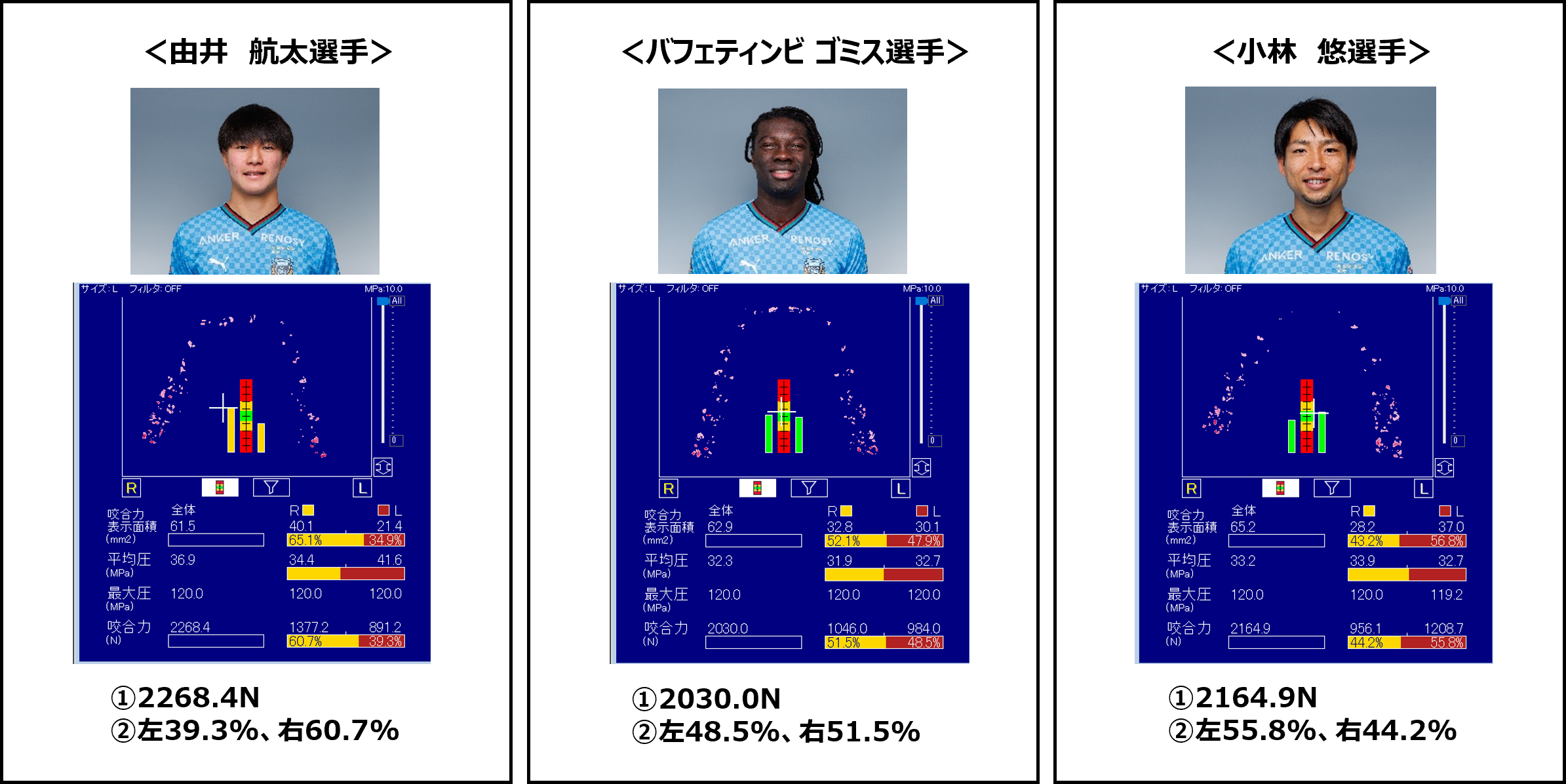 川崎フロンターレの選手を対象に、デンタルプレスケールⅡという器具を使用して、咬合力と左右のバランスを測定、自身の噛むチカラを可視化しました。20~30代男性35名を対象に測定した平均咬合力が1484.3N※という結果の中、3名もの選手が脅威の2000Nを超える結果となりました。咬合力が一番強いのは由井選手という結果に。由井選手は「自分の咬合力が強いことがわかりました。1日でも早くピッチに立って、サポーターの皆さんの前でプレーできるように頑張ります」とコメントしました。噛むチカラ測定を実施した選手たちからは「スポーツは噛む力が大切なため、自分の咬合力や左右の噛むバランスなど自分の状態を知ることができてよかったです」といった感想が寄せられました。安藤選手からは「試合前にガムを噛んでリラックスして試合に臨み、勝ち試合をみなさんに見せられるようにしたいです」とサポーターに向けてのメッセージをいただきました。