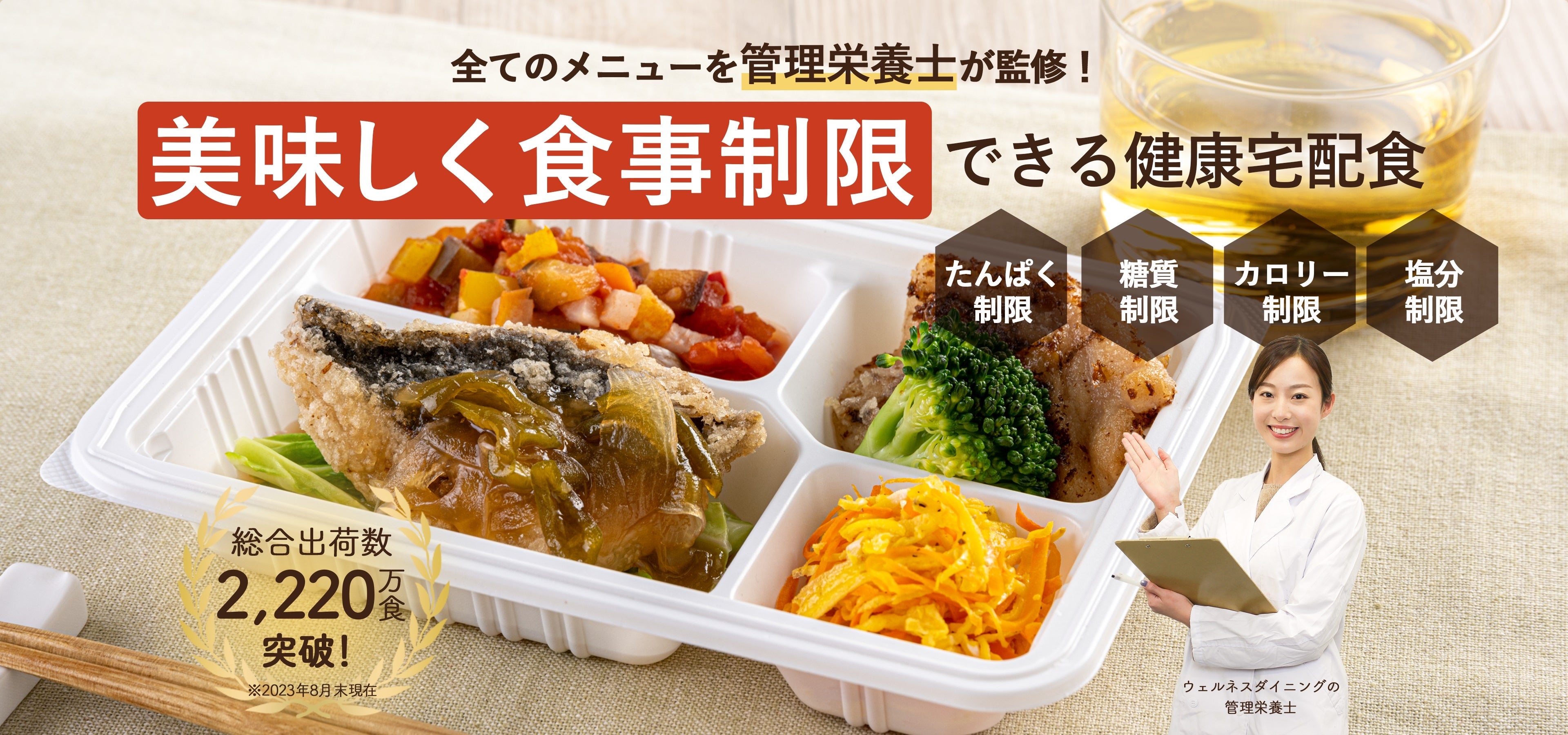 ウェルネスダイニングは食事制限専門の「健康宅配食」と「栄養相談」を提供する会社としてお客様の健康をサポートしています。創業以来、総合出荷数2,200万食(2023年8月現在)をお客様にお届けをしており、最近では健康経営に取り組む企業、団体が増える中で「健康面のサポート」に関してご相談いただく機会も増えております。