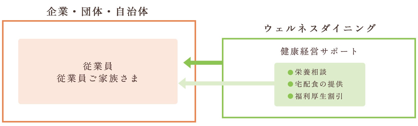 当社では健康経営に取り組む企業・団体への具体的なソリューションとして、企業の健康経営サポートや、福利厚生割引としての還元、従業員・そのご家族様への栄養相談サポートや宅配食の提供に力をいれております。