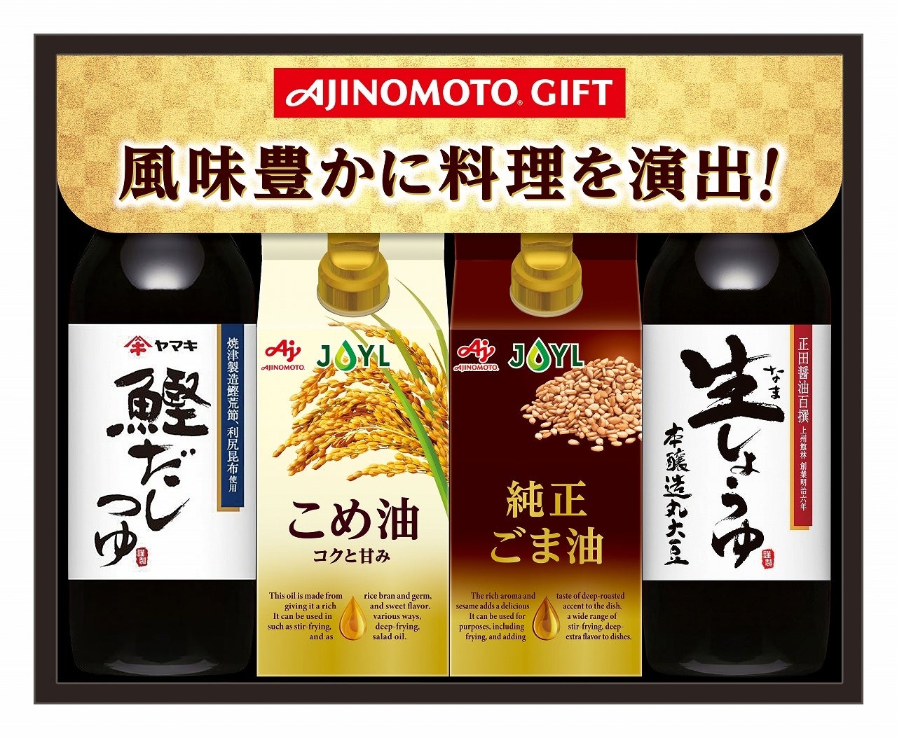 風味豊かなごま油などの食用油と、こだわりのだしつゆ、生しょうゆを詰め合わせたバラエティ豊かなアソートギフトです。食用油には、環境に配慮した紙パックを使用し、プラスチック使用量を約70%*削減しています。(*従来同容量帯容器との比較)