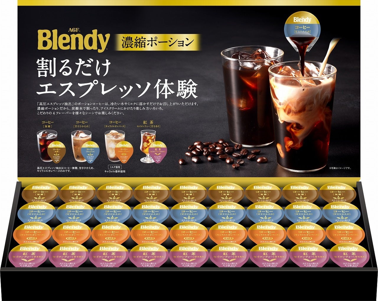 「ブレンディ®」ポーション濃縮コーヒー無糖と甘さひかえめに加え、人気フレーバーを詰め合わせたアソートギフトです。水や牛乳で割るだけで簡単にお楽しみいただけます。