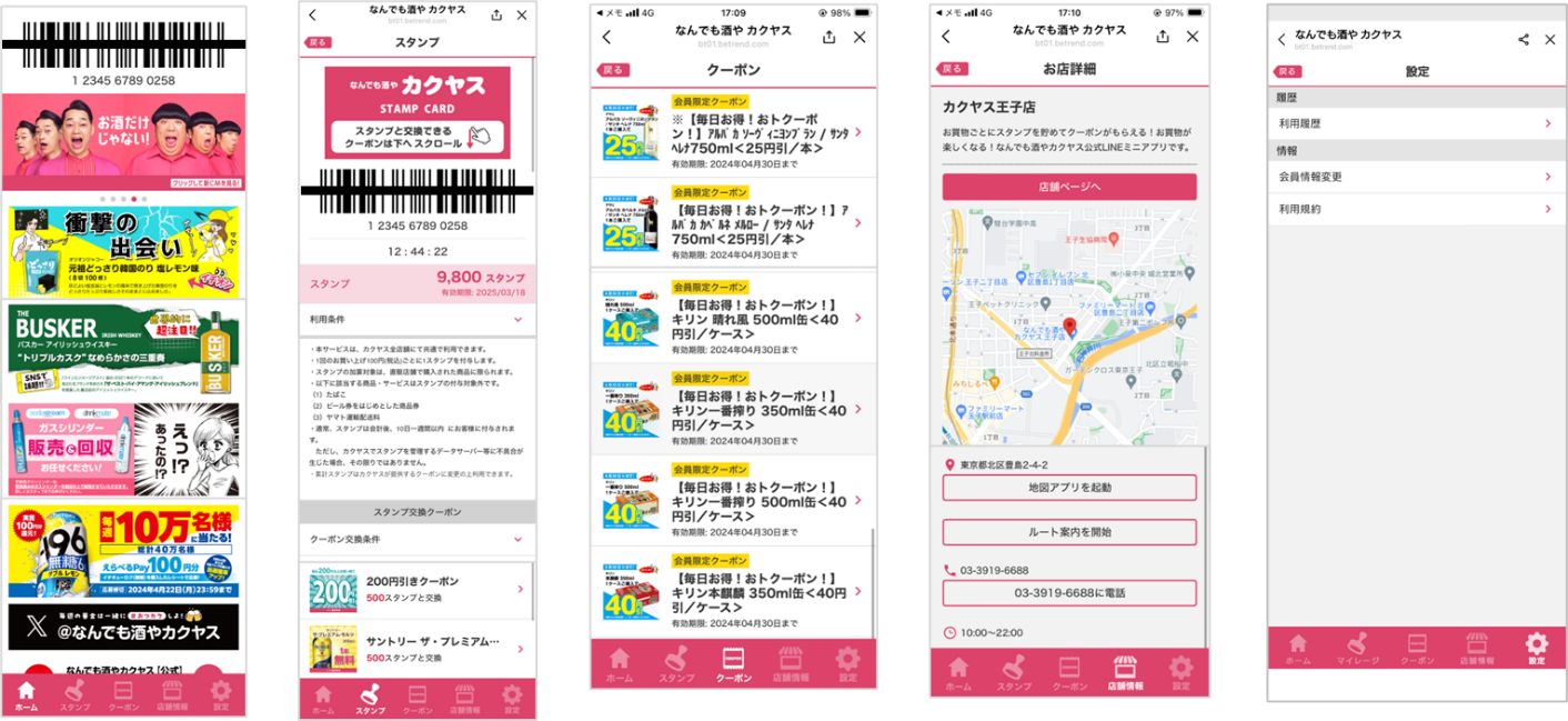「LINEミニアプリ」はお近くのカクヤス店舗のLINE公式アカウントのお友だち登録をしていただいた後、LINEアプリ内でカクヤスの公式LINEアカウント「なんでも酒やカクヤス」とお友だち登録することでご使用いただけます。登録後、お得なクーポンと引き換えできるスタンプカードを発行され、店頭購入金額(税込)100円につき1スタンプが付与されます。また、店頭で実施されているお得なキャンペーン情報や誕生日や期間限定で発行されるクーポン特典を取得することができます。
