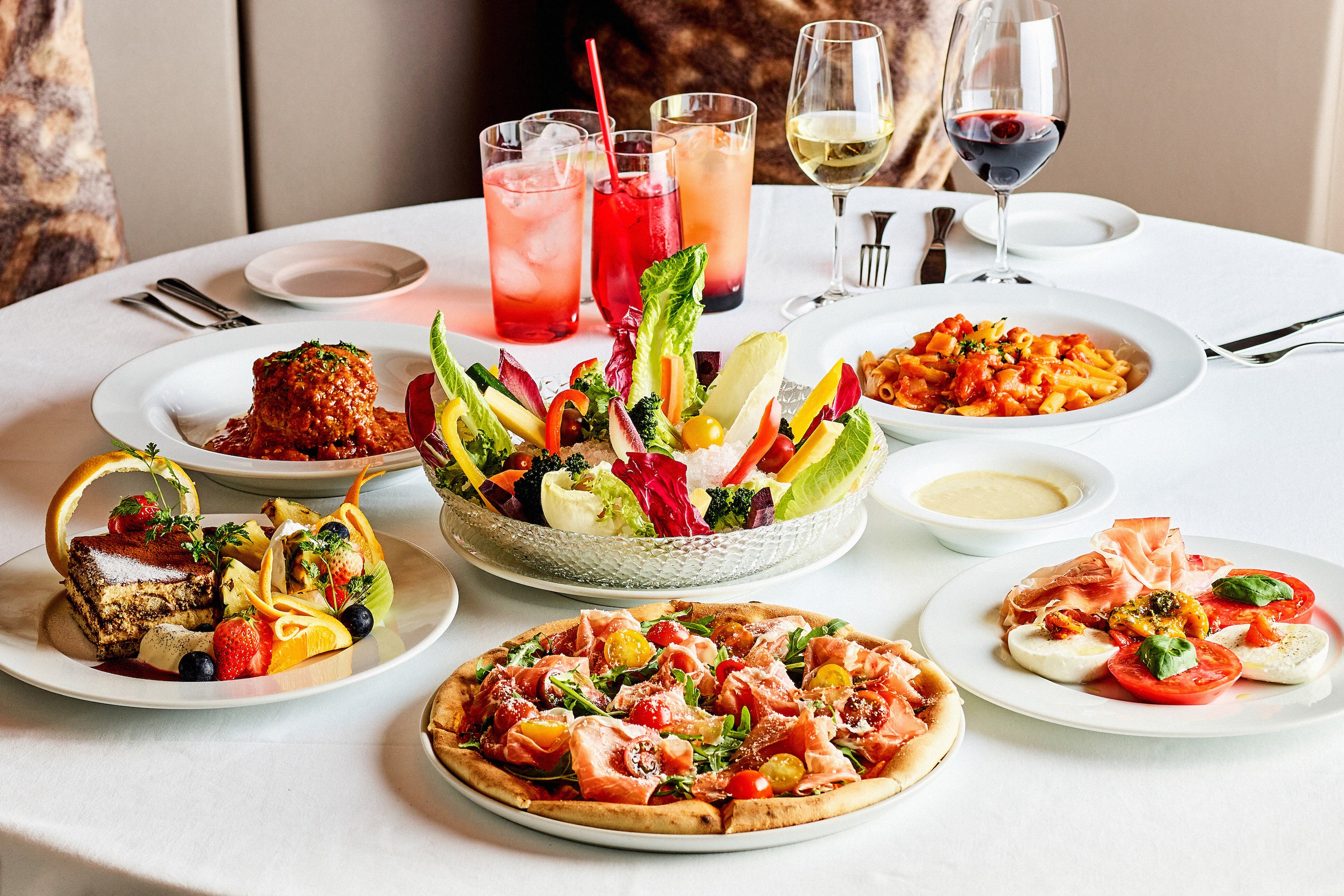 ハンドメイドのピザやパスタ、シェフ厳選のフレッシュな食材を使用した本格イタリアンを始め、フレッシュベルーガキャビア、トリュフ等の高級食材もお楽しみいただけます。バーテンダーによるオリジナルカクテルや豊富なレンジのワインもご用意しています。
