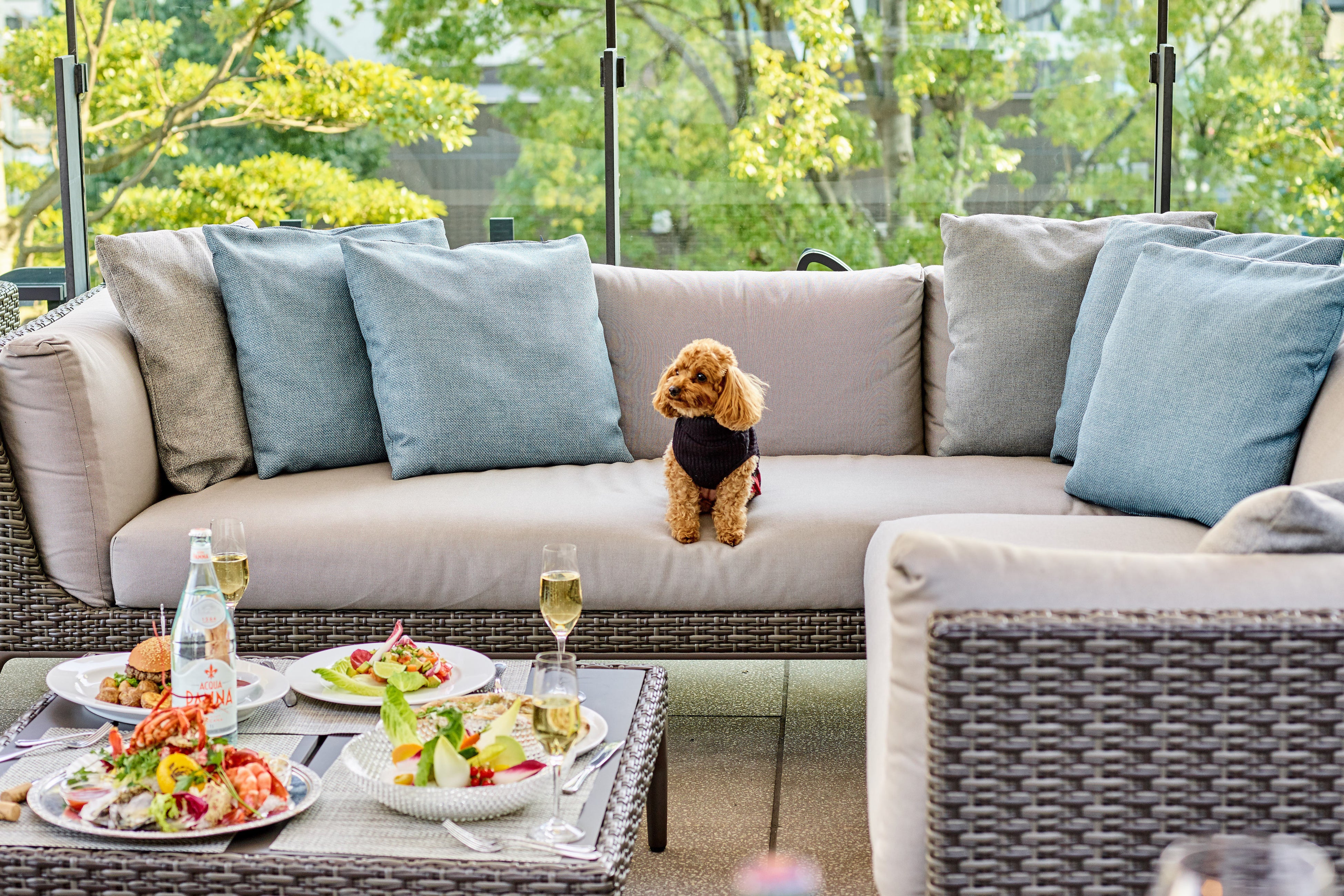 イル・ルピーノ・プライムのテラス席では、ペット同伴も可能ですので、ご友⼈と⼤切な家族の⼀員を伴って楽しい時間をお過ごしいただけます。