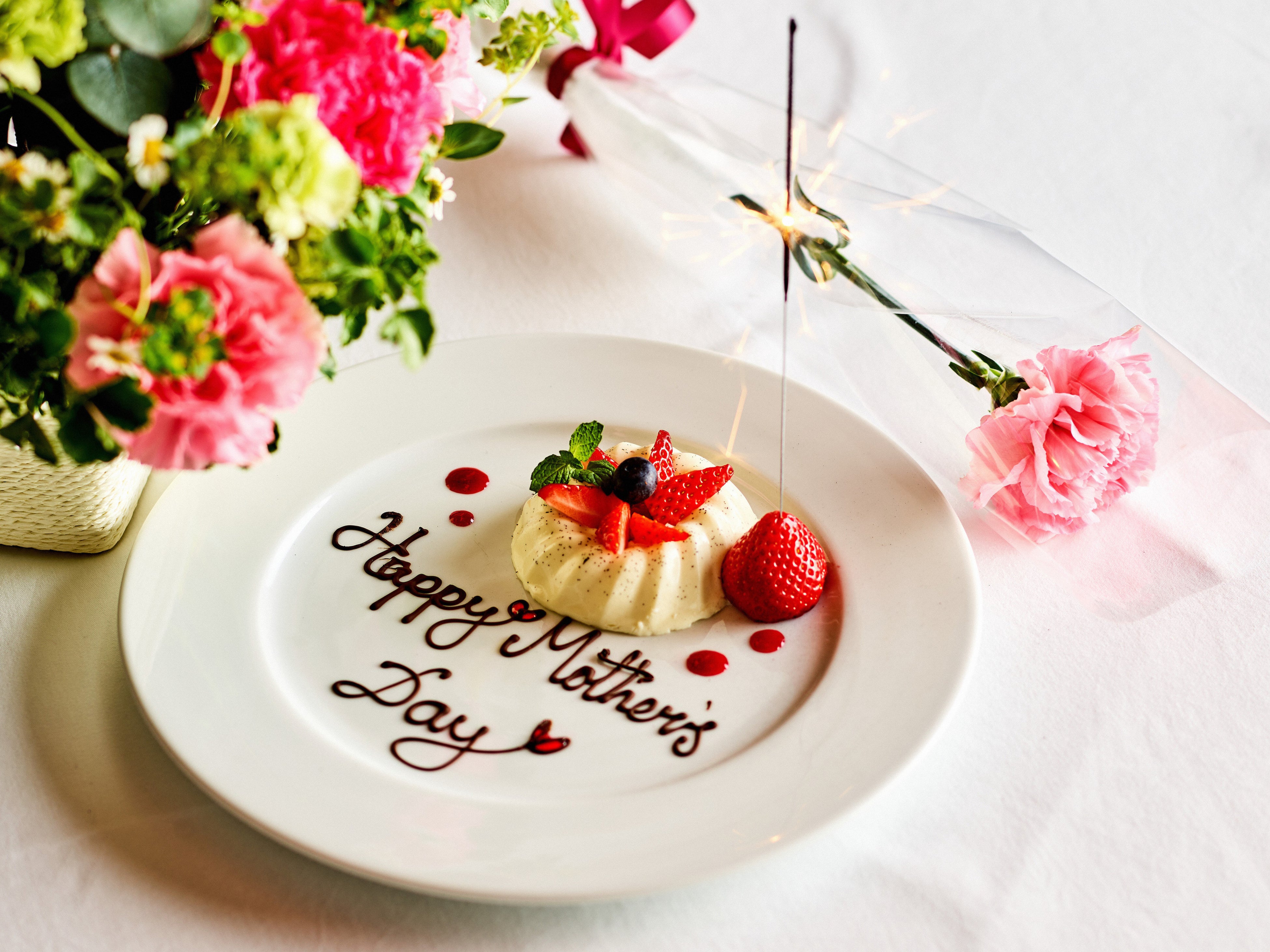 お食事の最後に、感謝のメッセージを記したデザートプレートとカーネーション一輪をお母様にご用意し、思い出に残るシーンを演出します。