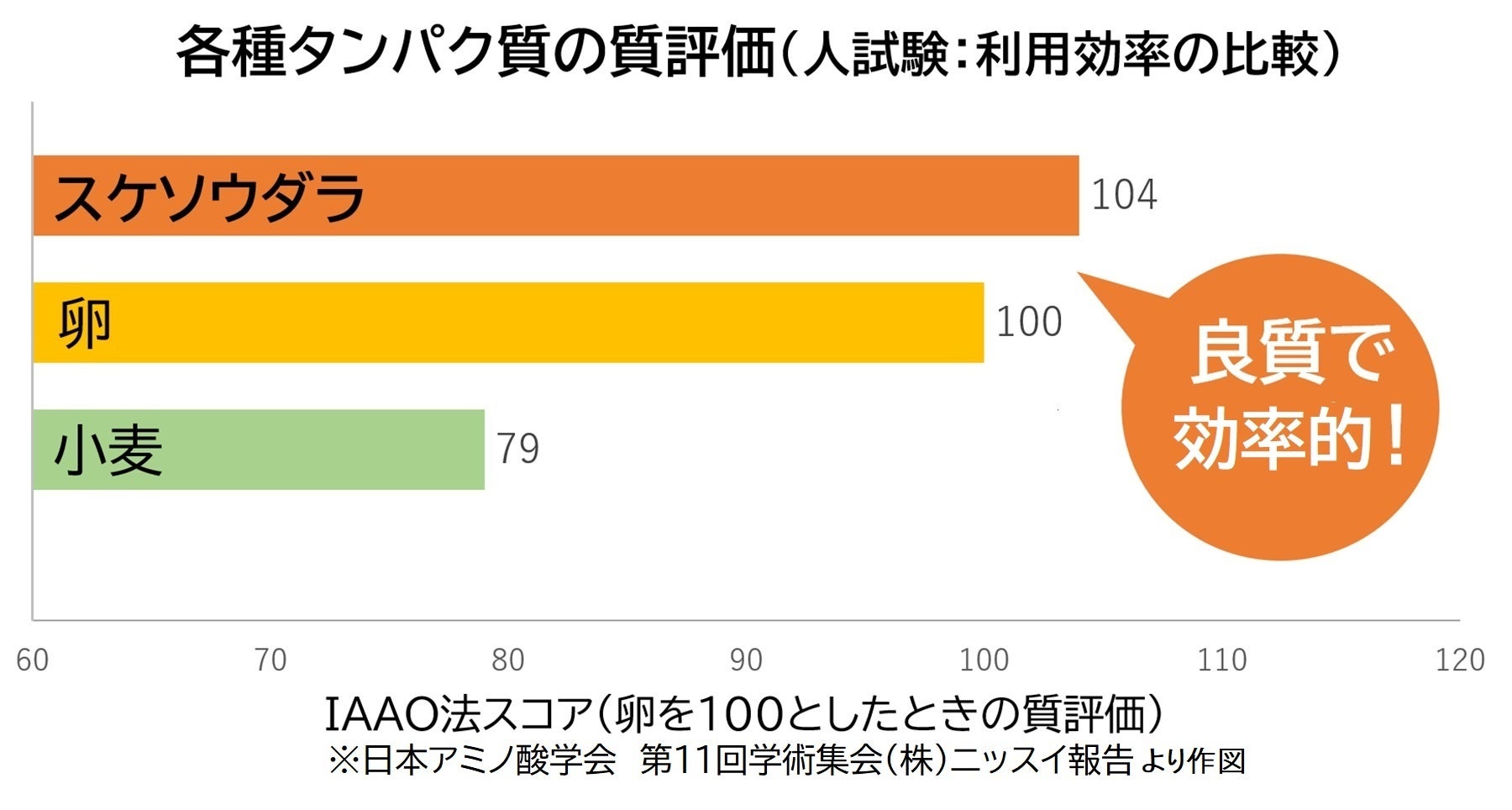 ニッスイ社の機能性研究では、白身魚のスケソウダラの「速筋タンパク」はタンパク質の質(体へ利用される割合)が良く、良質なタンパク質であることが確認されています。