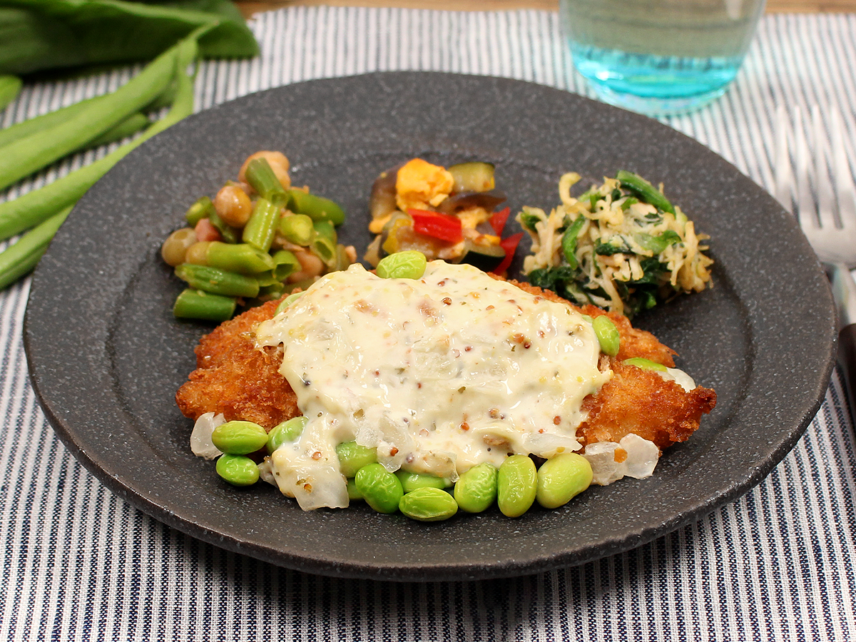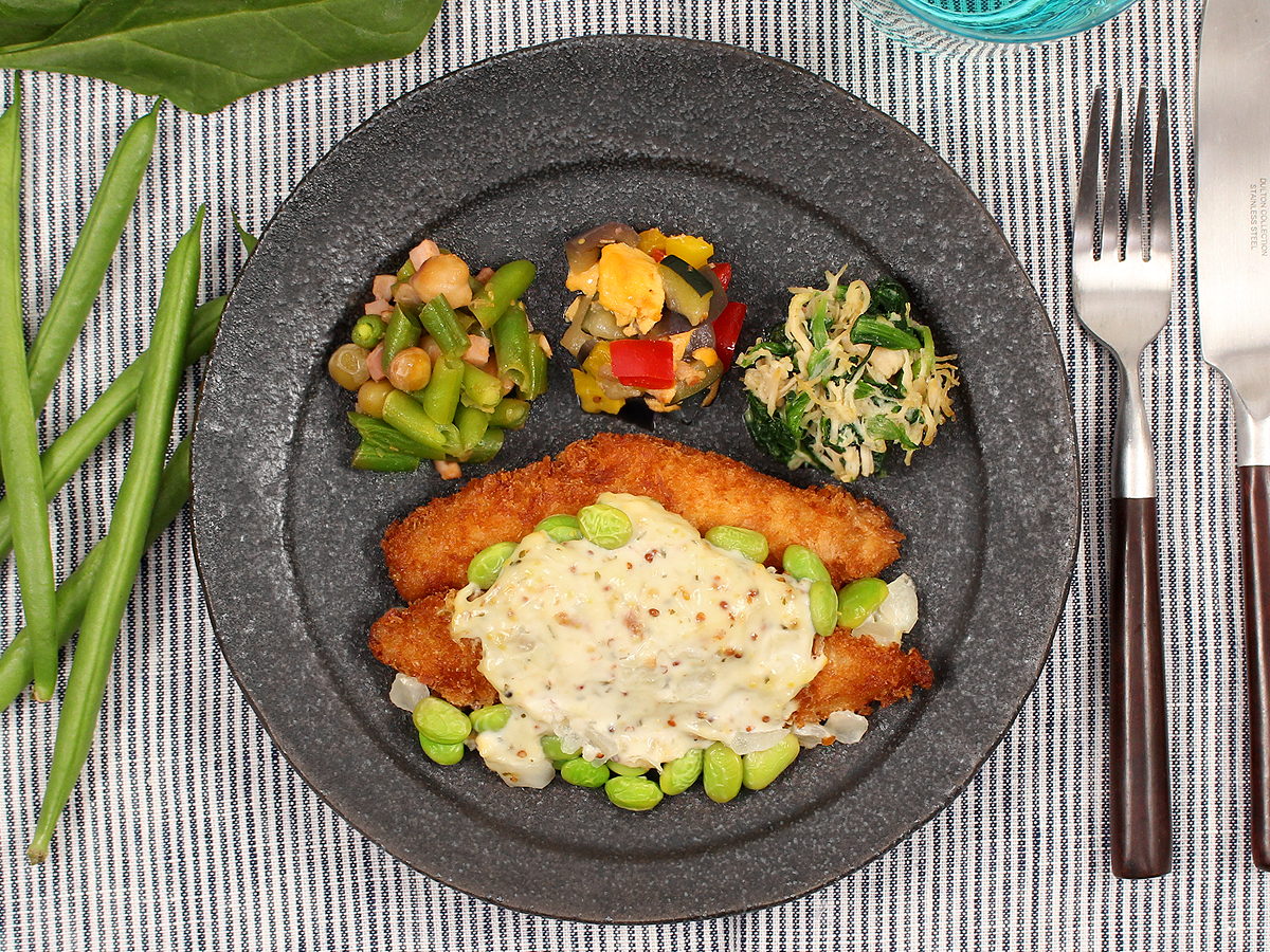 すけそうだらのフライに、粒マスタードをきかした甘酢っぱいタルタルソースをかけました。アクセントのブラックペッパーが味に深みを持たせます。