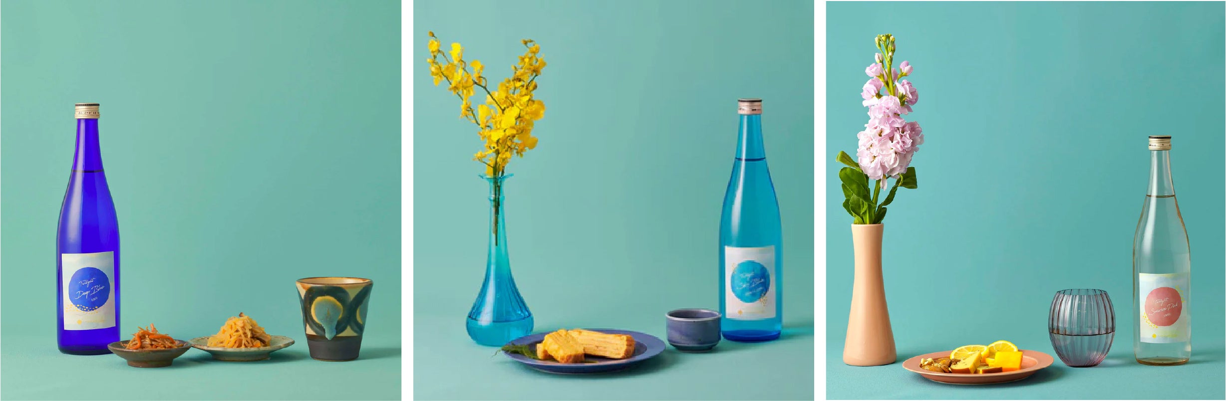 夜から朝になるほんの少しの時間、白い空から広がってくる綺麗な水色をイメージ。低温でゆっくり発酵させた、無濾過、1度火入れの純米吟醸酒。米の旨味の後にさわやかな酸味が通り抜けます。