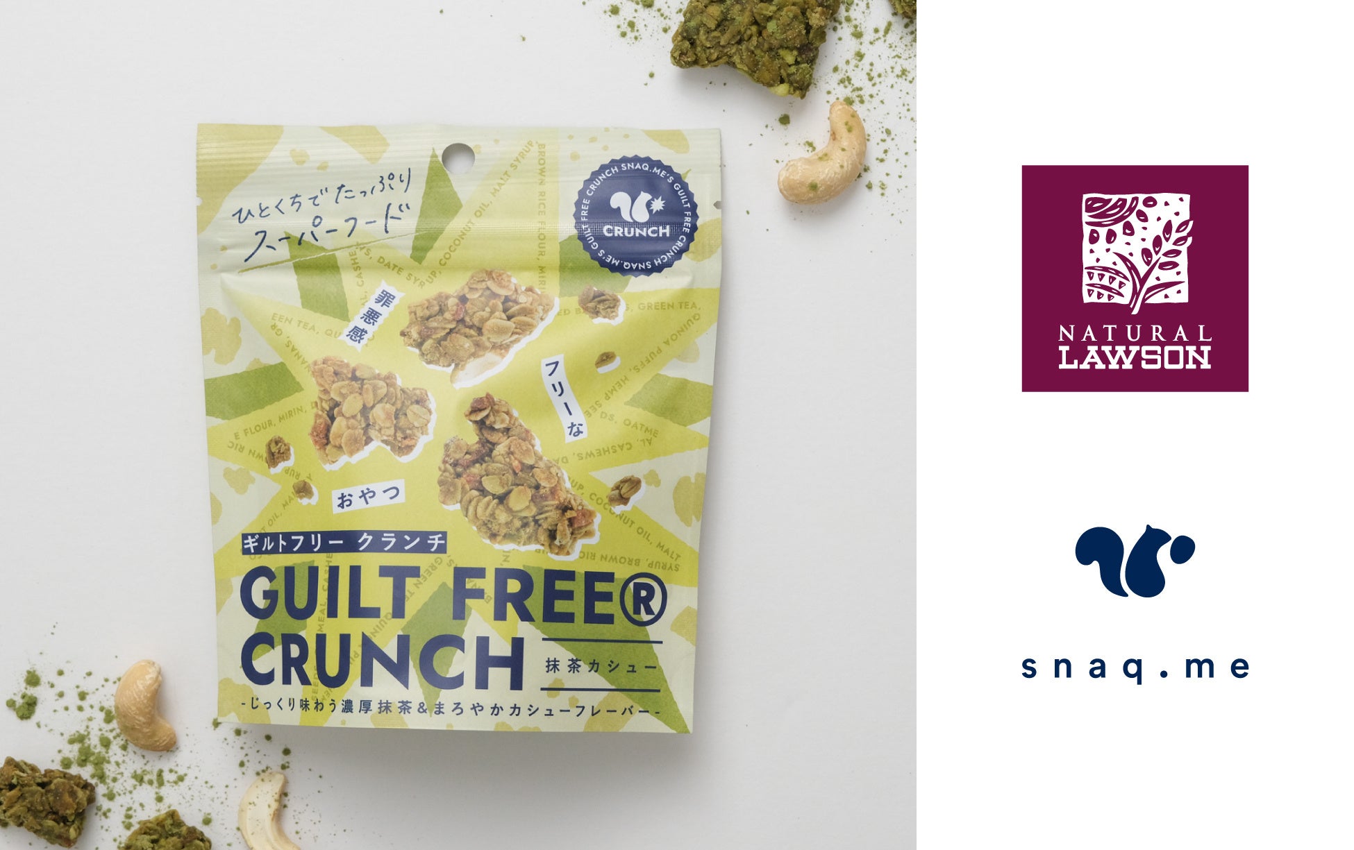株式会社スナックミー(本社:東京都中央区 / 代表取締役:服部慎太郎)は、罪悪感ゼロで楽しめるスーパーフードおやつ「ギルトフリークランチ」シリーズから登場した「ギルトフリークランチ 抹茶カシュー」を株式会社ローソンが首都圏で展開するナチュラルローソンへの供給を開始いたしました。2024年4月23日(火)から首都圏(東京都、神奈川県、埼玉県、千葉県)で展開するナチュラルローソン約131店舗(※)で販売されます。