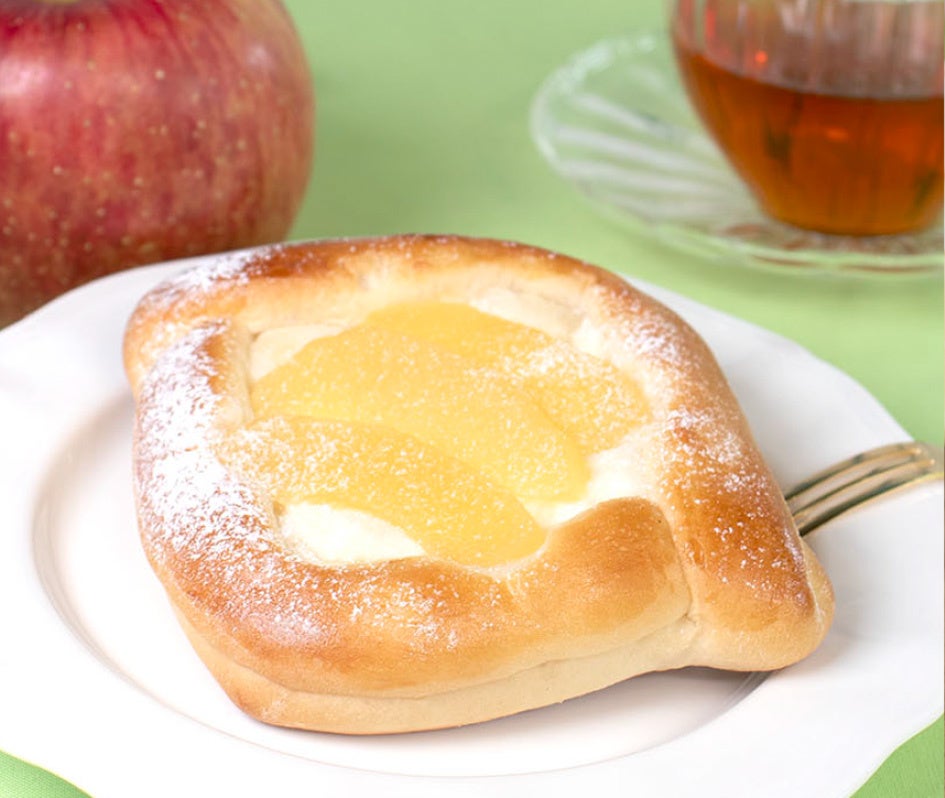 商品特徴:シャキシャキ食感が楽しめる大きくカットしたりんごと爽やかな甘さのクリームチーズが美味しいスイーツパン。