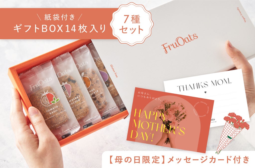 オートミール×おからのグルテンフリークッキー「FruOats(以下、フルオーツ)」(運営:株式会社フルオーツ)は、2024年4月24日(水)より「<母の日限定メッセージカード付>オートミール×おからのグルテンフリークッキー7種セット 14枚入り」の販売を開始いたします。