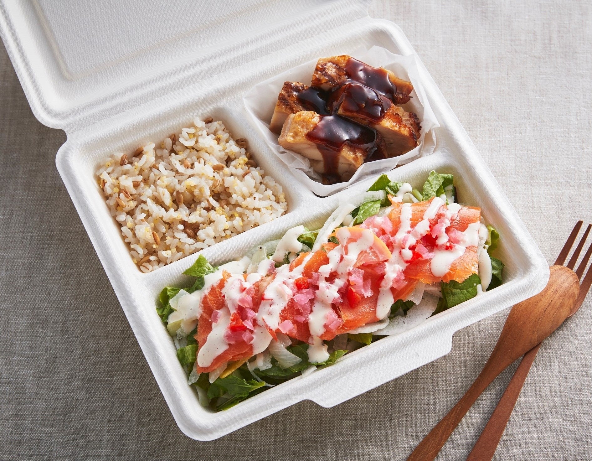 サーモントラウトの旨みとスモークの上品な香りを楽しめるサラダが主役。焼いたオニオンの甘み、ルッコラの香り、ピクルスの酸味がスモークサーモンのおいしさを引き立てます。お渡し時にビネガー入りマヨネーズソースをおかけします。塩麹に漬けてローストしたチキンはバルサミコ醤油で味付けしており、ご飯によく合います。