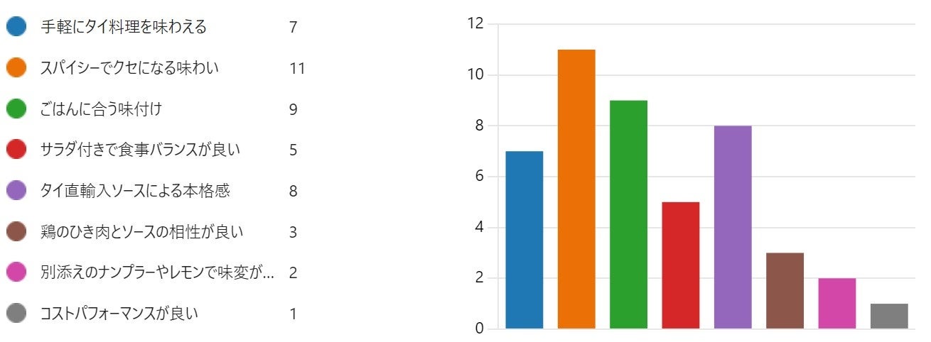 「ガパオライス」で最も多くの票を集めたのは『スパイシーでクセになる味わい』というポイントでした。以下2位は『ごはんに合う味付け』、『タイ直輸入ソースによる本格感』でした。