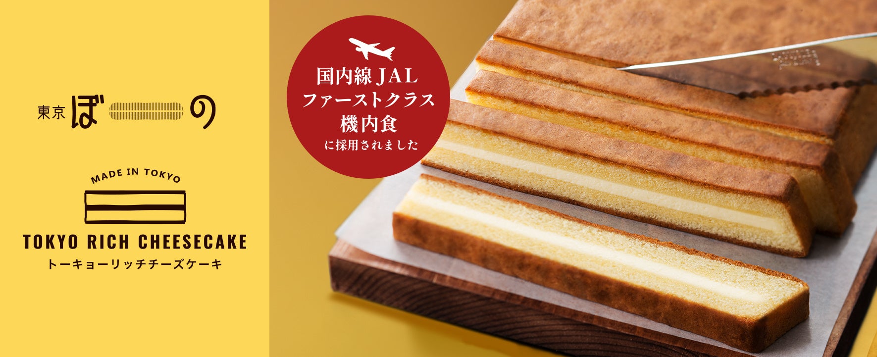 『東京ぼーの』は東京で製造を始めて十数年、これまで多くのお客様にご愛顧いただいております。長年のご愛顧のおかげで、代表作の『トーキョーリッチチーズケーキ』が2024年5月の国内線JALファーストクラスの機内食に採用されました!『トーキョーリッチチーズケーキ』とは、北海道、フランス、ニュージーランドの3種のチーズを絶妙にブレンドし、クリーミーに仕上げたチーズケーキを、しっとりとしたカステラで挟みじっくりと焼き上げたスティックスタイルのチーズケーキです。今年で3年連続の採用※となる『東京ぼーの』。GWのお出かけでご搭乗の際は、なめらかな口溶けと濃厚なチーズの香りをぜひお楽しみください。