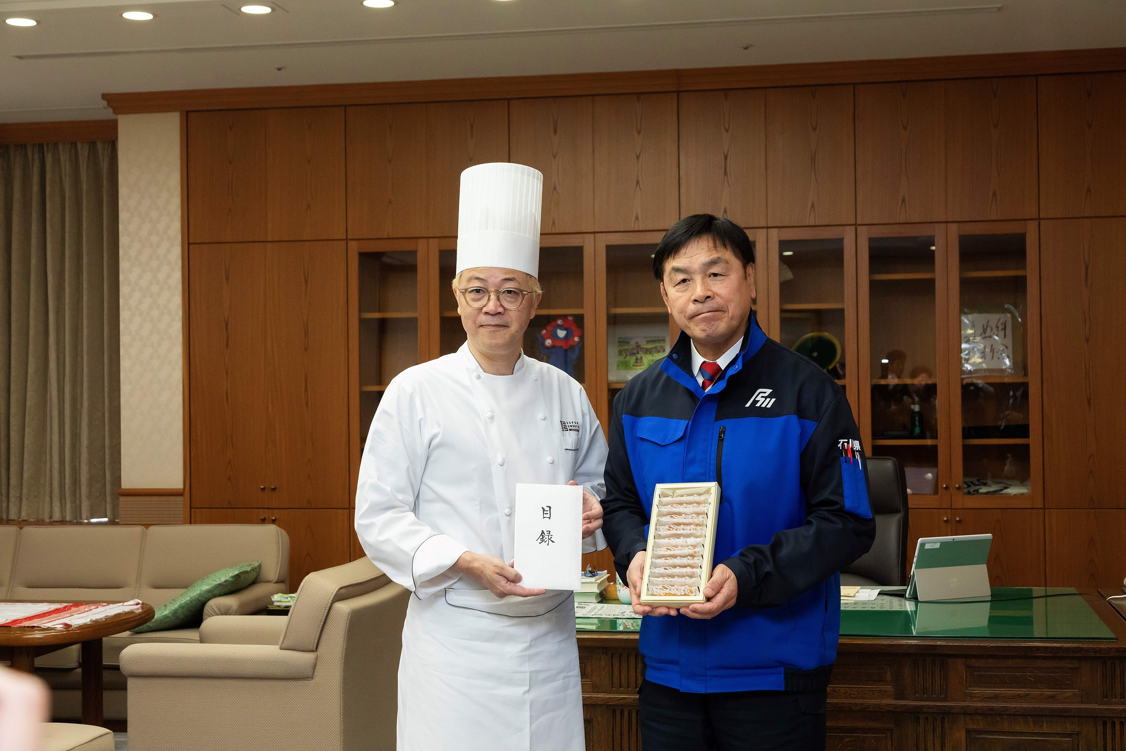 能登半島地震発災から10日後には被災地に入り、非常食や手作りのお菓子を避難所に届けたり、炊き出しを手伝うなど災害ボランティア活動を行った報告及びグループ店舗をはじめ、辻口博啓の呼びかけに賛同した全国のパティスリー、レストラン、 製菓材料メーカーなどから寄せられた義援金をお渡し、能登地震における被災者救援・復興・復旧活動・子どもたちの未来への一助として役立てていただくようお願いを致しました。
