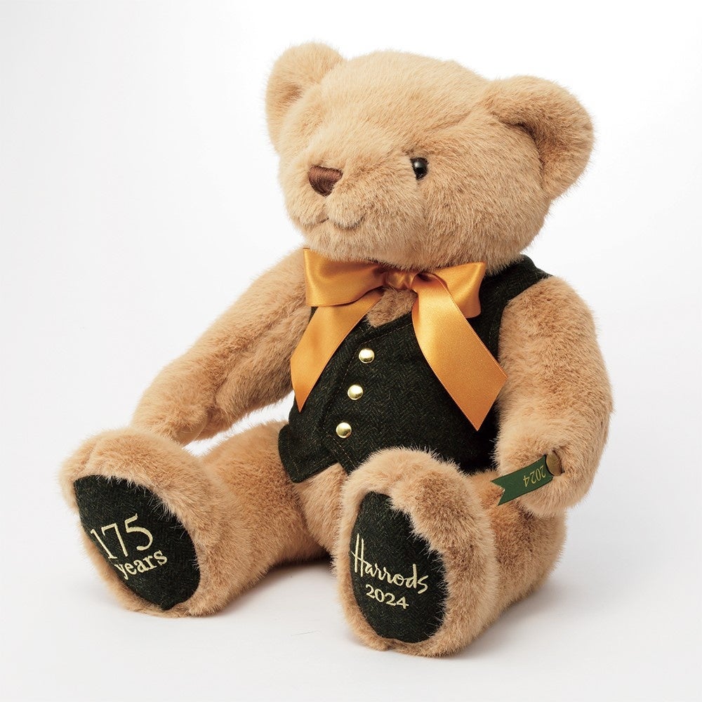 英国の老舗百貨店〈ハロッズ〉創業175周年記念のヘンリーベアです。シグネチャーカラーのグリーンとゴールドで、小粋な紳士のベアに。