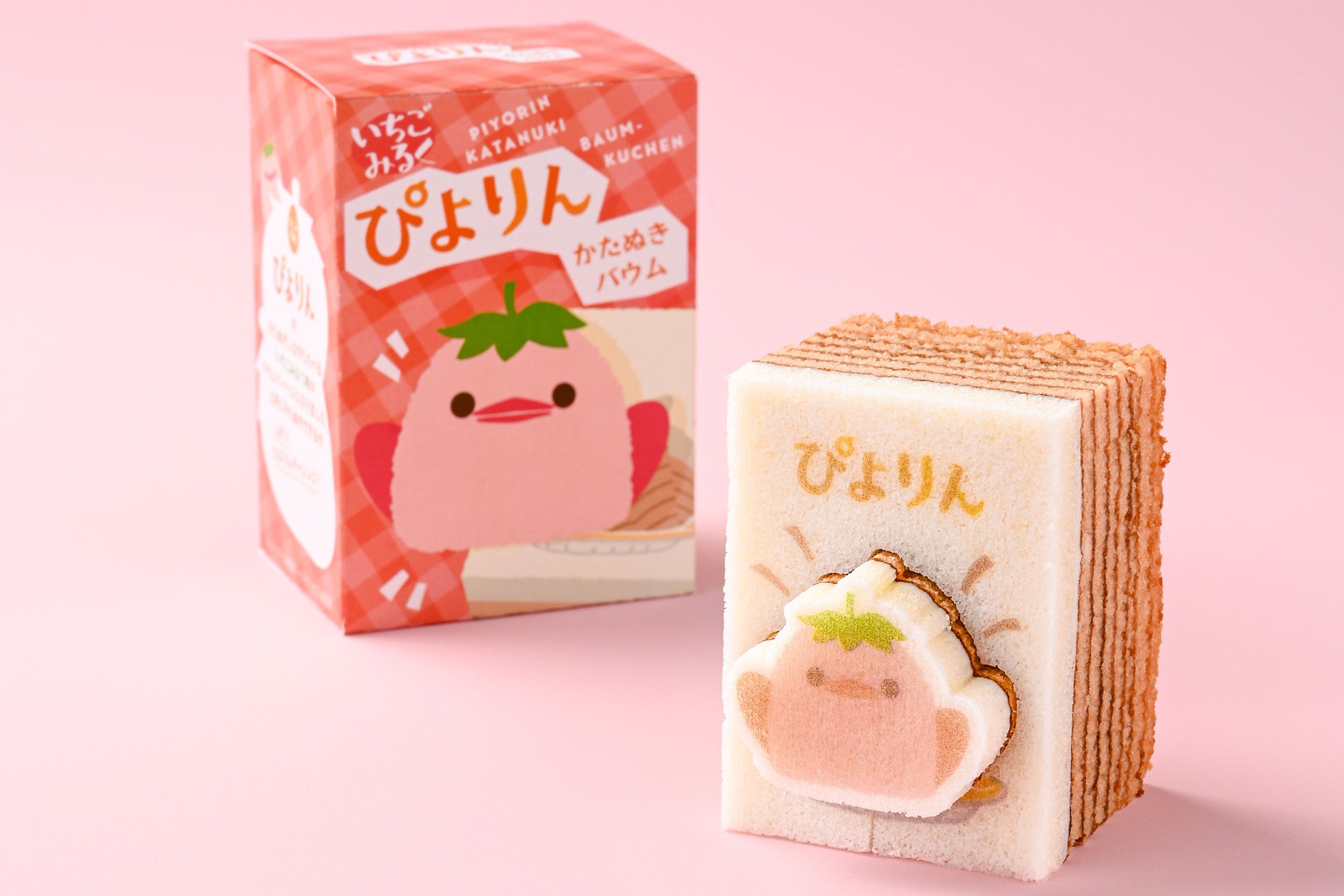 名古屋の⼤⼈気スイーツ「ぴよりん」と、型ぬきバウムの専⾨店『カタヌキヤ』のコラボレーションにより誕⽣しました。平焼きのバウムクーヘンに⽩いメレンゲ⽣地を重ね、その上にぴよりんをイラストで表現。絵柄を縁取るようにカットラインがはいっており、まわりの⽣地をはずして型ぬきしながら食べるバウムクーヘンです。定番のプレーン味の商品ほか、期間限定で登場する“ぴよりんかたぬきバウム”にもご注⽬ください。