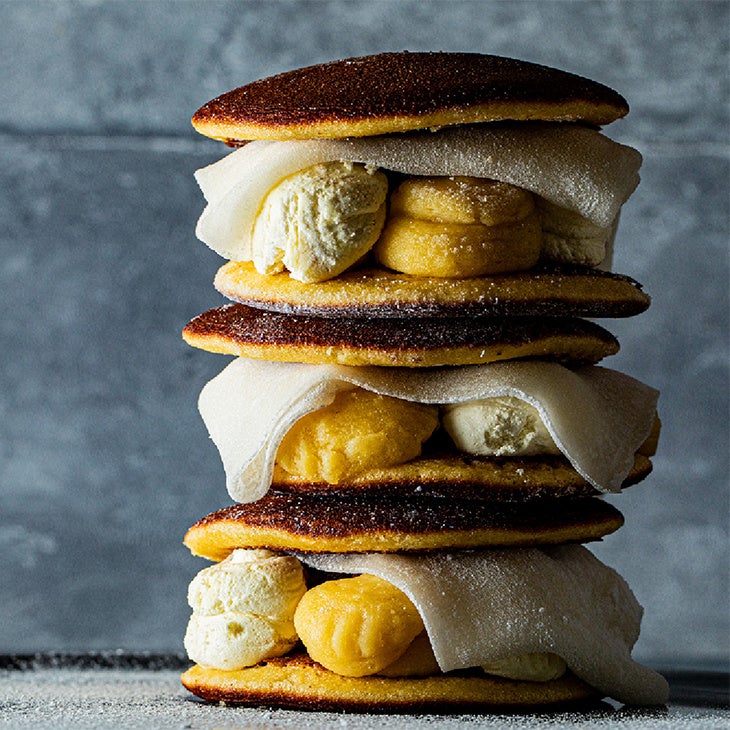 上品な甘さのクリームと芋餡、もっちり食感の福井名物羽二重餅を挟んだどら焼き。