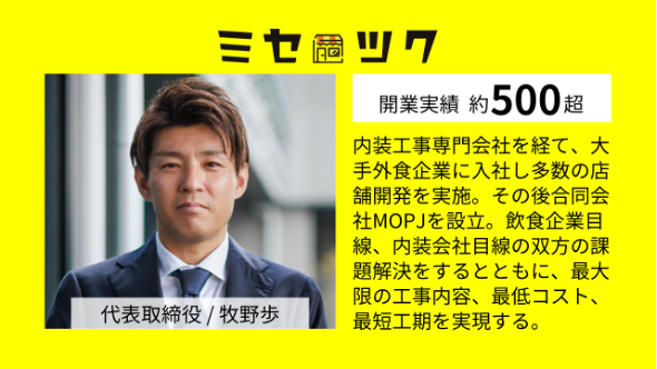 大手飲食チェーンは店舗開発部門を社内に有し、戦略的に店舗出店と運営を行っています。しかし個人で開業予定の飲食店オーナー様はその部門がなく一店舗一店舗独自で全てを行わなければなりません。「ミセツク」は個人飲食店の「店舗開発部門」として出店から運営サポートの役割を担うプラットフォームです。