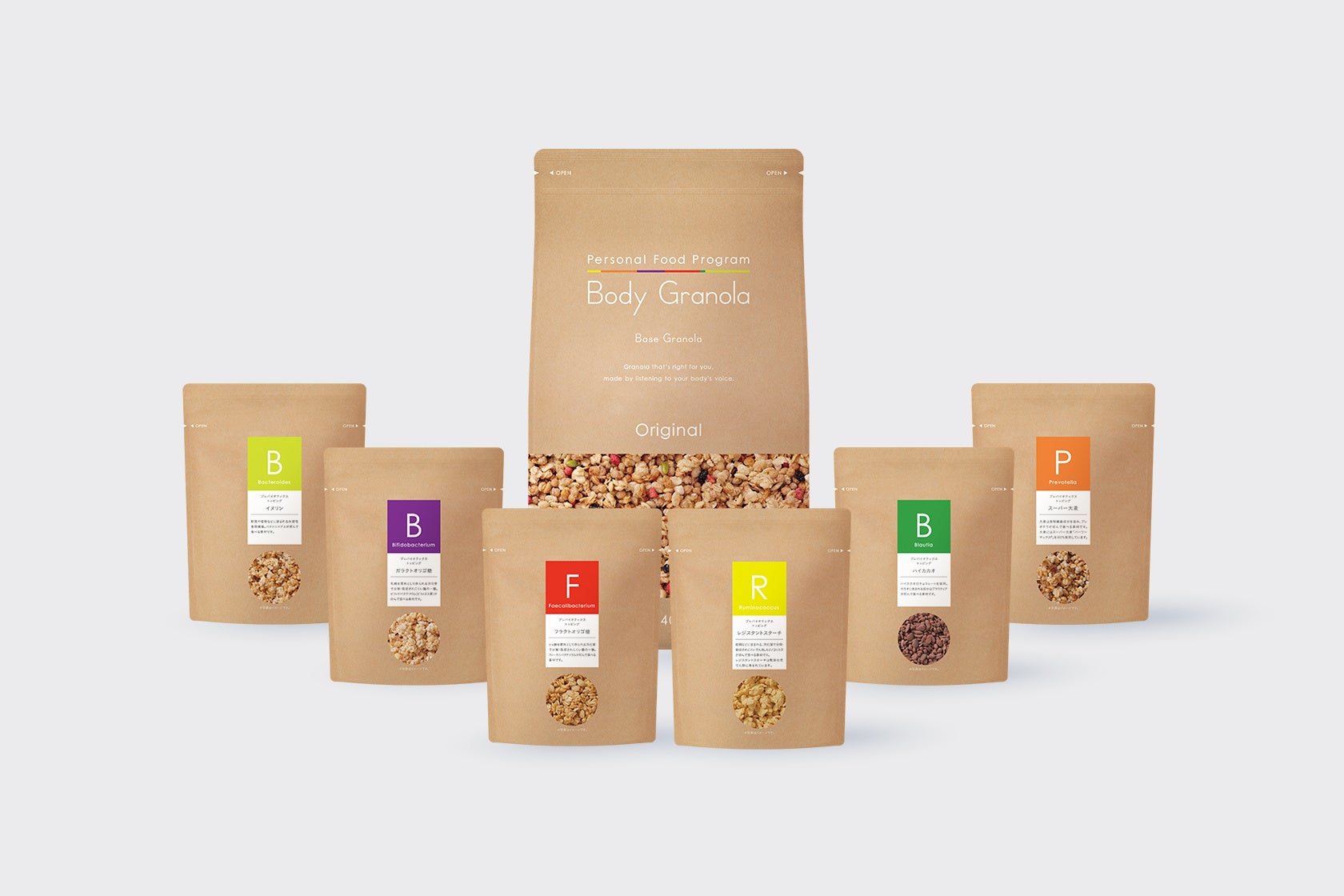 腸内に存在するおよそ1,000種類、約40兆個の菌による生態系「腸内フローラ」。『Body Granola』は、自身の腸内フローラにどのような菌がどれくらい存在するかを解析し、その結果を参考に、腸内の菌が好んで食べる素材を含むグラノーラ(プレバイオティクス※2トッピング)を選ぶ、定期購買サービスです。カルビーが成長戦略で掲げる「食と健康」領域の新たなビジネスモデルとして確立し、5年間で延べ10万人に利用していただくことを目標に据えています。