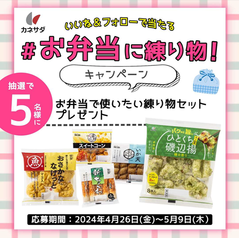 魚肉ねりものメーカーの株式会社かね貞(本社:愛知県みよし市、代表取締役会長:松原邦夫、URL: https://www.kanesada.com/)は、『#お弁当に練り物!キャンペーン』を実施します。4月26日(金)~5月9日(木)の期間中に、かね貞 Instagram 公式アカウント(@kanesada_nelicatessen)のフォローとキャンペーン投稿へいいねをしてくれた方の中からかね貞のお弁当で使いたい練り物セットを合計 5 名様にプレゼントいたします。皆さまからのご応募をお待ちし