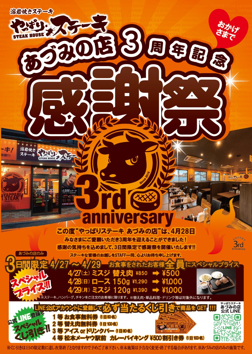 4月28日にやっぱりステーキあづみの店は3周年を迎えます。