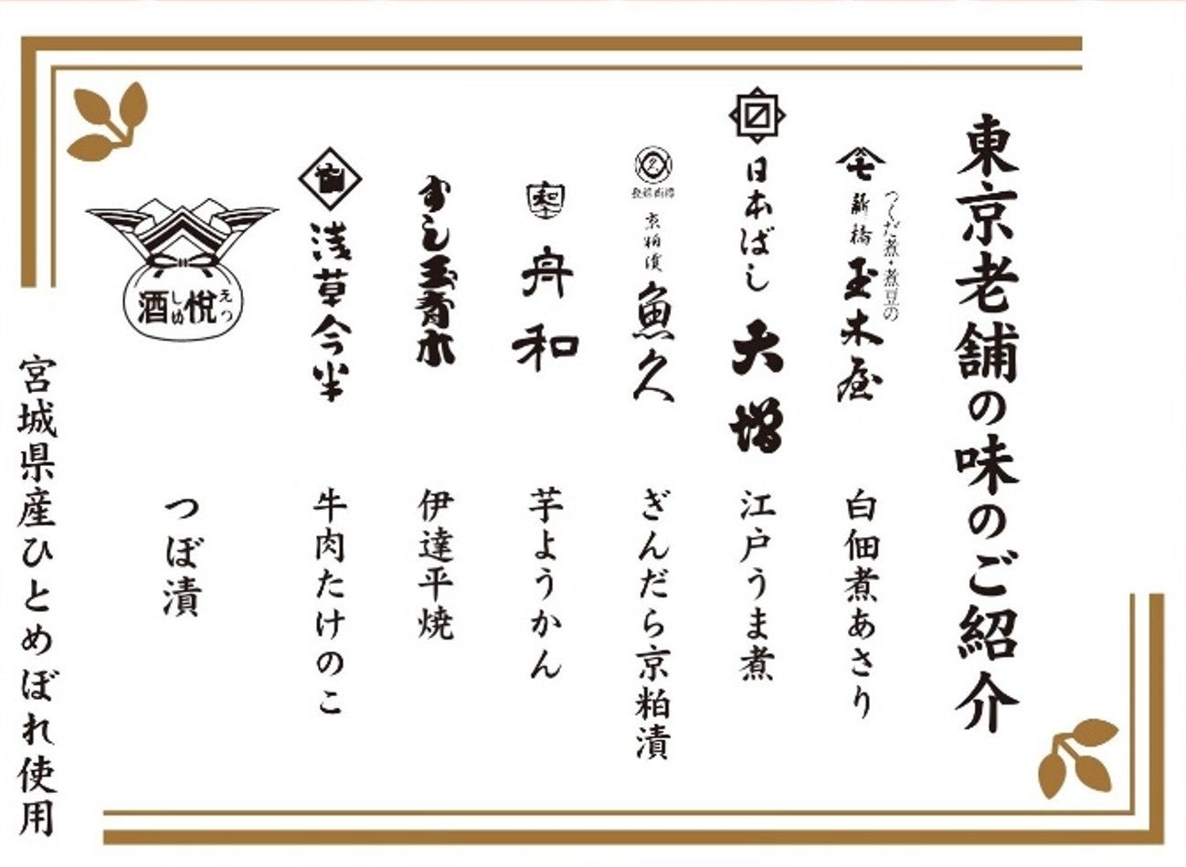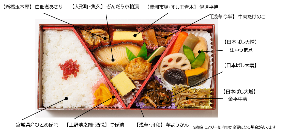今回は、焼き魚を「人形町・魚久」の一切れずつ手作りで仕上げた「ぎんだら京粕漬」へ変更し、ご飯は甘味・粘り・つや・うまみ・香りのバランスが良い「宮城県産ひとめぼれ」を使用、掛け紙も装い新たに一新しました。東京の老舗7店の味を贅沢に詰め合わせた「東京弁当」をぜひお愉しみください。