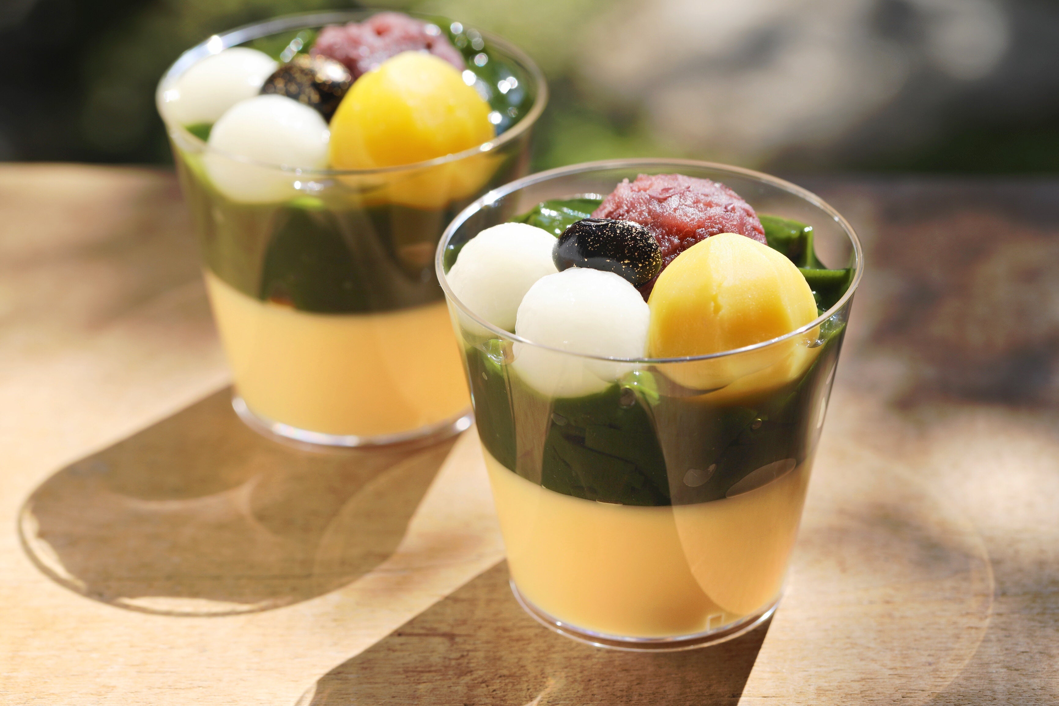 特徴の「宇治抹茶」を使用したゼリーを重ね、抹茶と相性が良い粒あん・白玉・黄栗・黒豆をトッピ