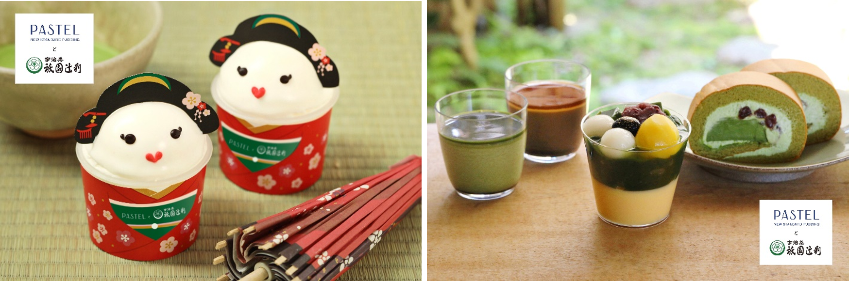 そしてこのたび、新緑の季節に合わせて、「パステル」と宇治茶専門店「祇園辻利」のコラボレーションが実現、「祇園辻利」の豊かな香りとまったりとした旨味・甘味が特徴の「宇治抹茶」、焙煎による高い香りと味わいが楽しめる「ほうじ茶」を使用した新商品『濃いプリン 舞妓さん』『祇園辻利の宇治抹茶使用 宇治抹茶プリンロール』『祇園辻利の宇治抹茶使用 宇治抹茶あんみつプリン』『祇園辻利の宇治抹茶使用 濃いプリン なめらか宇治抹茶』『祇園辻利のほうじ茶使用 濃いプリン なめらかほうじ茶』の5品を共同開発し、期間限定で販売いたします。