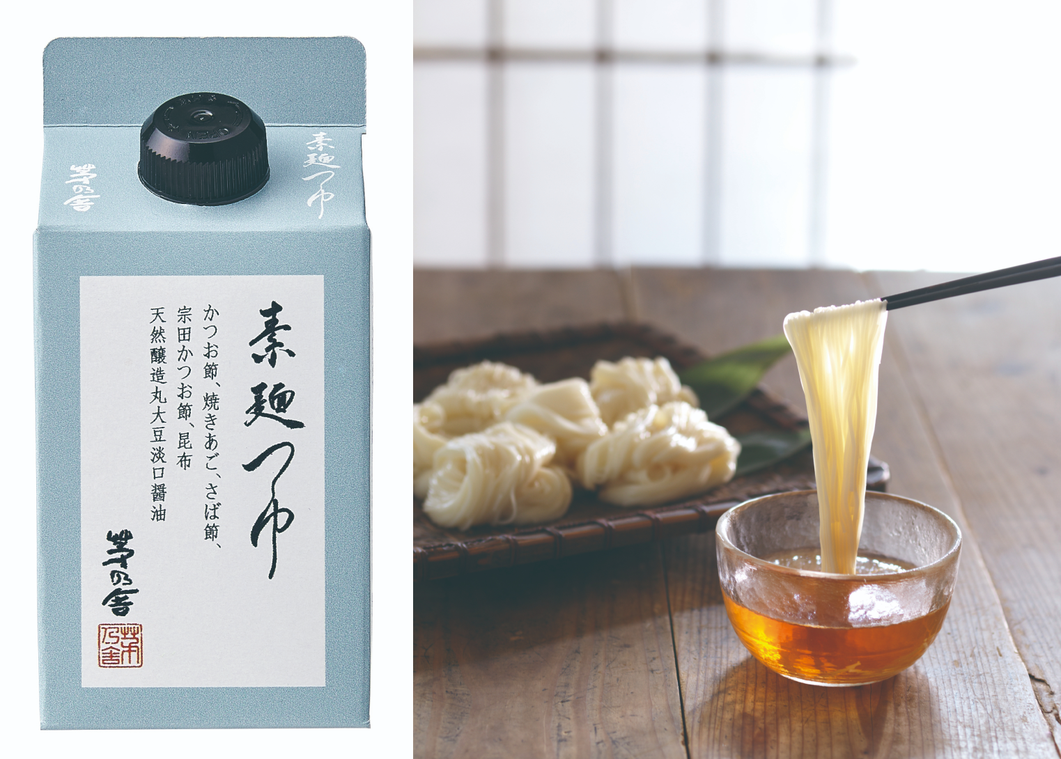 毎年人気の素麺つゆ。使用したのは、鰹節や焼きあご、昆布、宗田節、鯖節の5種類の国産素材。上質な素材の味を生かす製法で抽出した濃いだしに、天然醸造丸大豆の淡口醤油やみりんを加えて仕上げています。今年は従来のボトルタイプから、お客様のご要望にお応えして、破棄する時に負担の少ない紙パックタイプにリニューアルしました。上質感のあるデザインで、ギフトにもおすすめです。