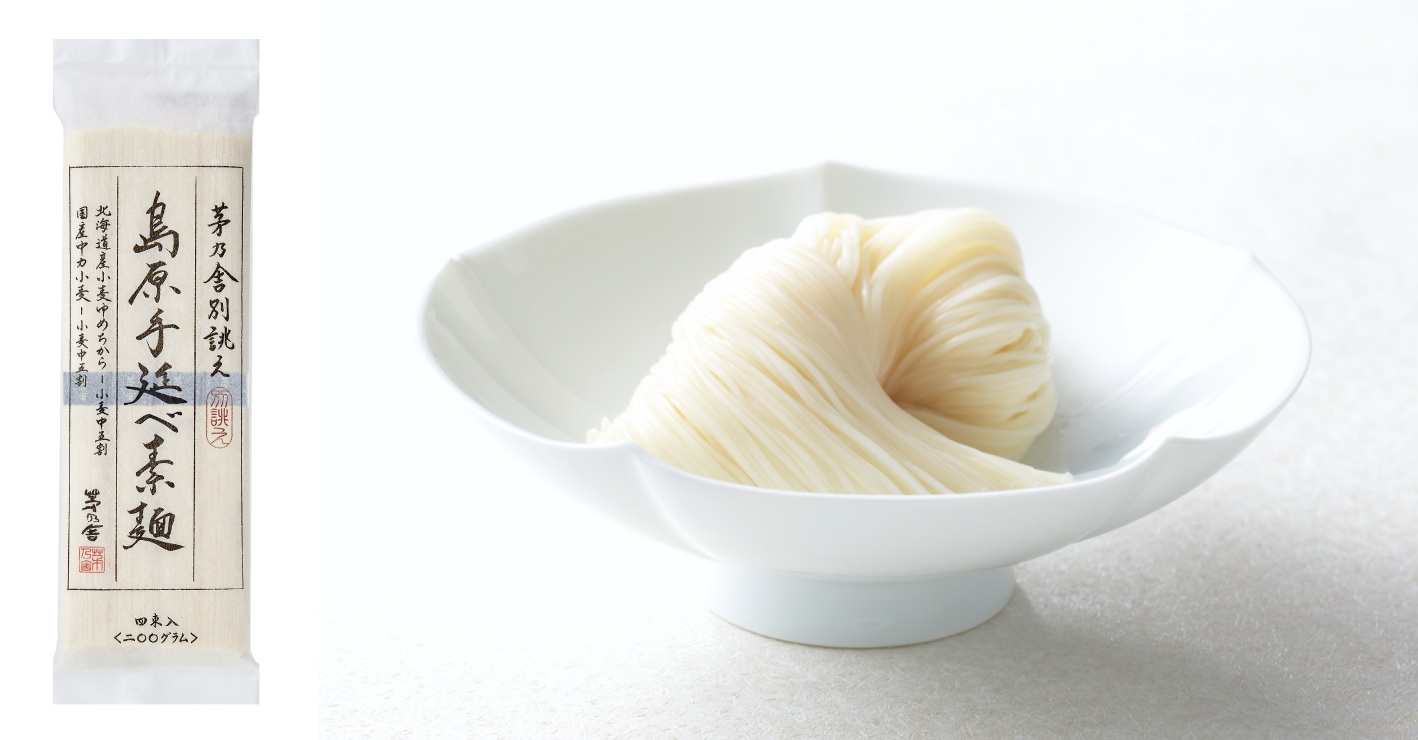 北海道産「ゆめちから」などの国産小麦を100%使用し、手延べ製法で仕上げた茅乃舎限定別誂え品。細くてしなやかな麺は、もっちりとしながらも、歯切れよく、なめらかです。素麺づくりに最適な冬季に製造しています。