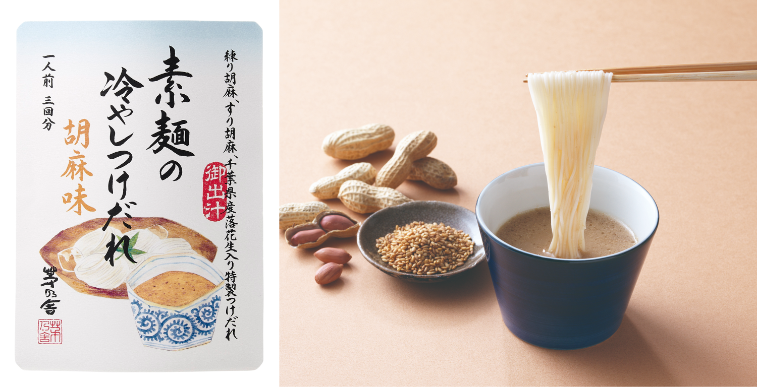 夏に何度も食べる素麺だから、多彩な楽しみ方で味わっていただきたい。そんな思いで、鰹だしをベースにした冷たいつけだれ「素麺の冷やしつけだれ」を2種類ご用意しました。「胡麻味」は、練り胡麻の濃厚さとすり胡麻の香ばしさに加えて、千葉県産落花生やくるみ、きな粉を合わせています。「梅味」は、和歌山県紀州南高梅の梅肉と、爽やかな梅酢を使い、さっぱりとしたたれに仕上げています。