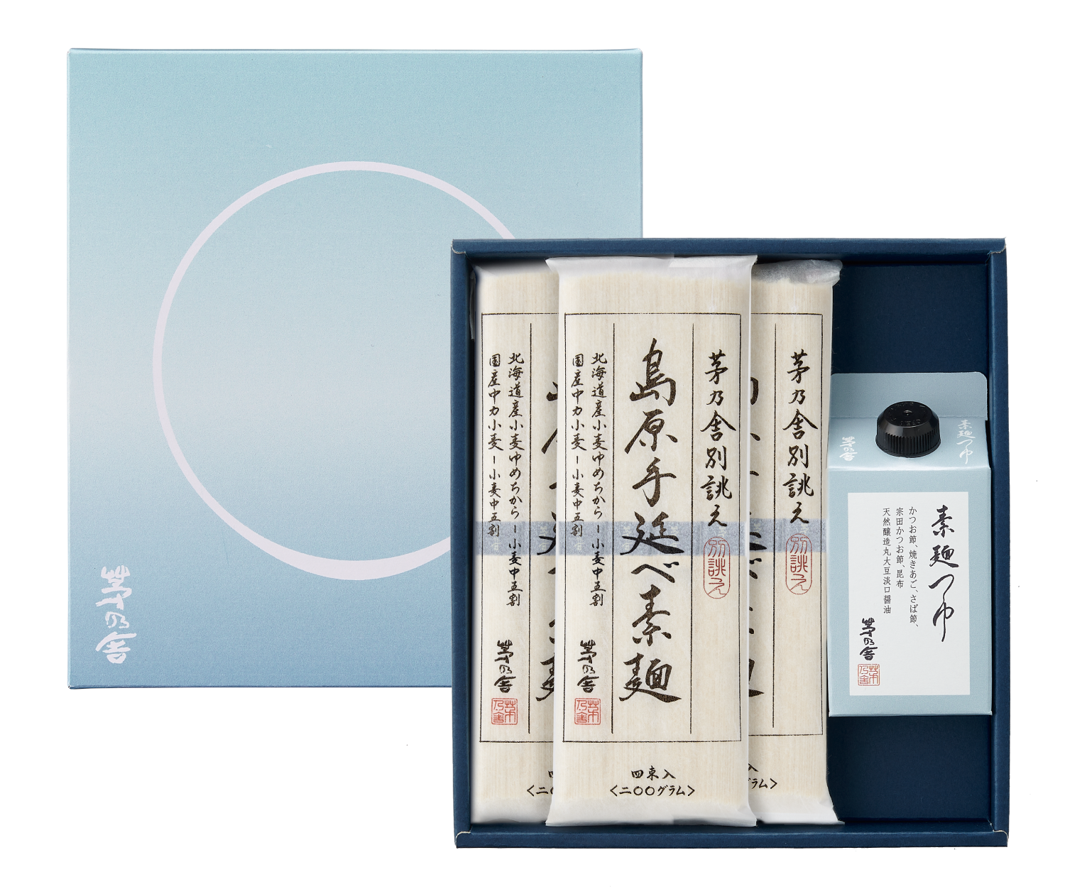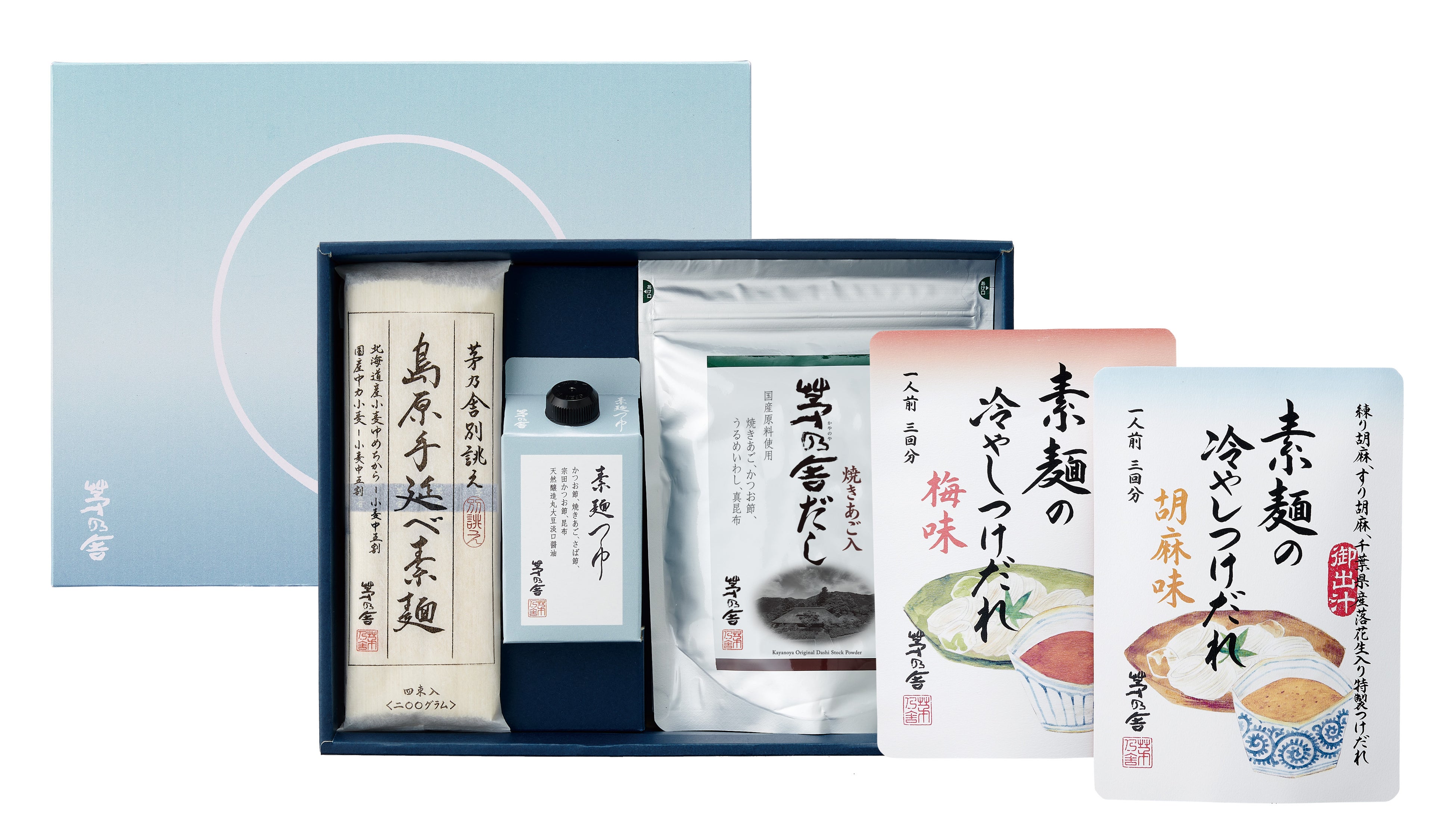 ・内容量:島原手延べ素麺(200g入)×3個、茅乃舎だし(12袋入)素麺つゆ(300ml入)、素麺の冷やしつけだれ 胡麻味(36g×3袋)、素麺の冷やしつけだれ 梅味(40g×3袋) /だし読本・素麺リーフ付き