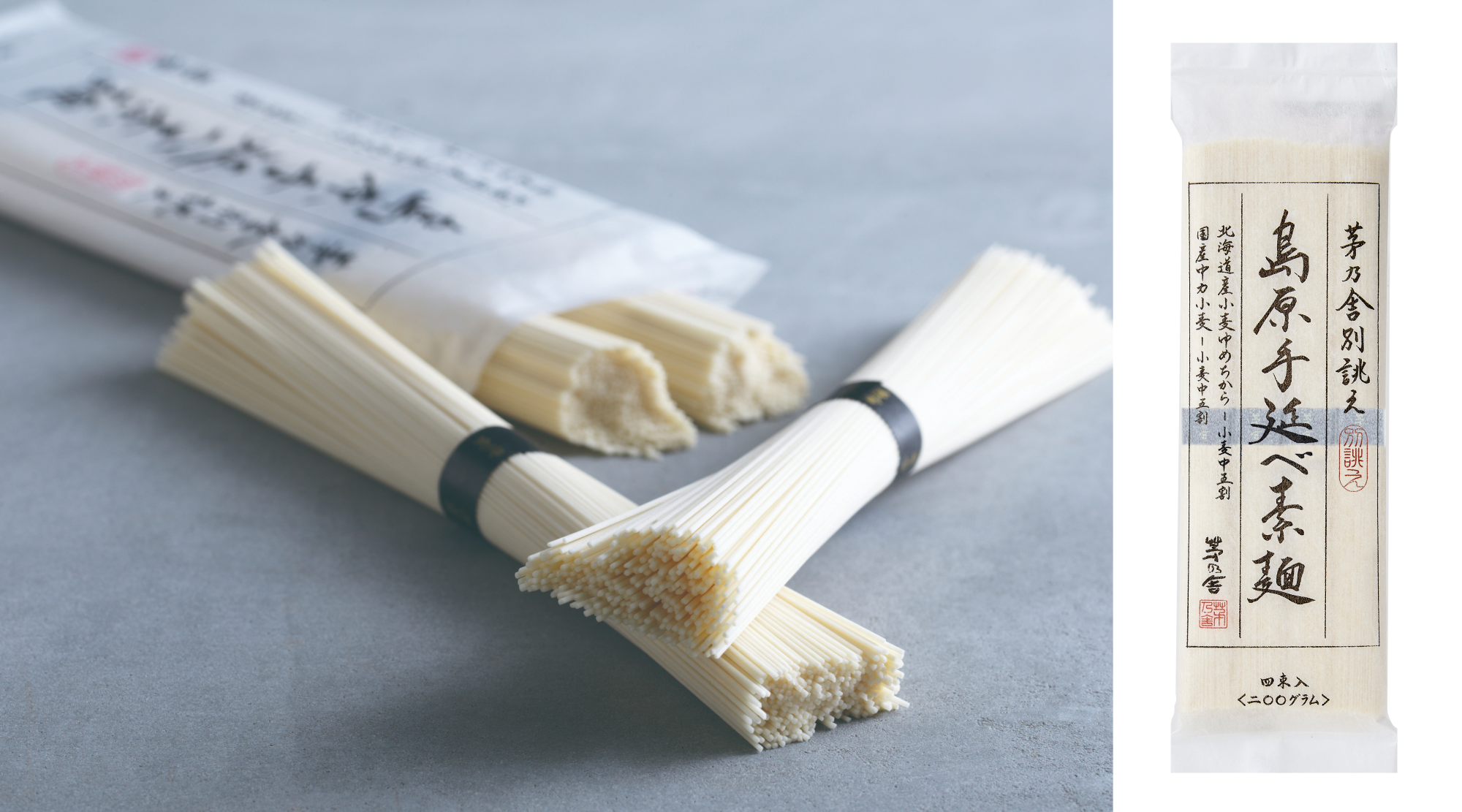 今回ご一緒したのは、自然豊かな長崎・南島原で、江戸時代から受け継がれてきた手延べの技法を守り続ける、島原手延素麺協同組合の皆さん。機械製麺では再現できない繊細な職人の技術と、時間をかけて丁寧に熟成させることで生まれる、しっかりとしたコシと歯ごたえ。手延べ素麺の魅力を全国へ広め、そして未来へ残したいという想いを共にし、茅乃舎の特注品である【茅乃舎 別誂え】シリーズとして皆さまのもとへお届けします。