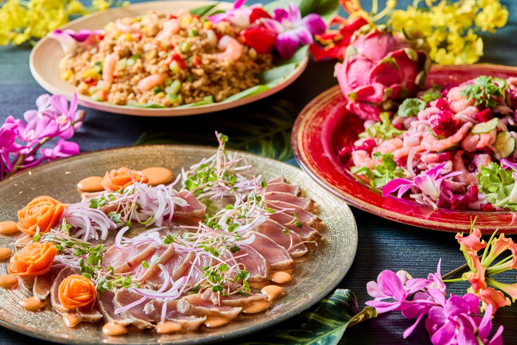 ヤムウンセン タイ風春雨サラダ(タイ)/ドラゴンフルーツのタイ風シーフードマリネ(タイ)/若鶏と3種のクラゲ 中華風マリネ(中国)/マグロのカルパッチョ コチュジャンソース(韓国)/ベジタリアンコーナー(厚揚げともち麦の豆乳白和え/スパイシーなキヌアのタブレサラダ/冷製赤インゲン豆トマトの煮込み)