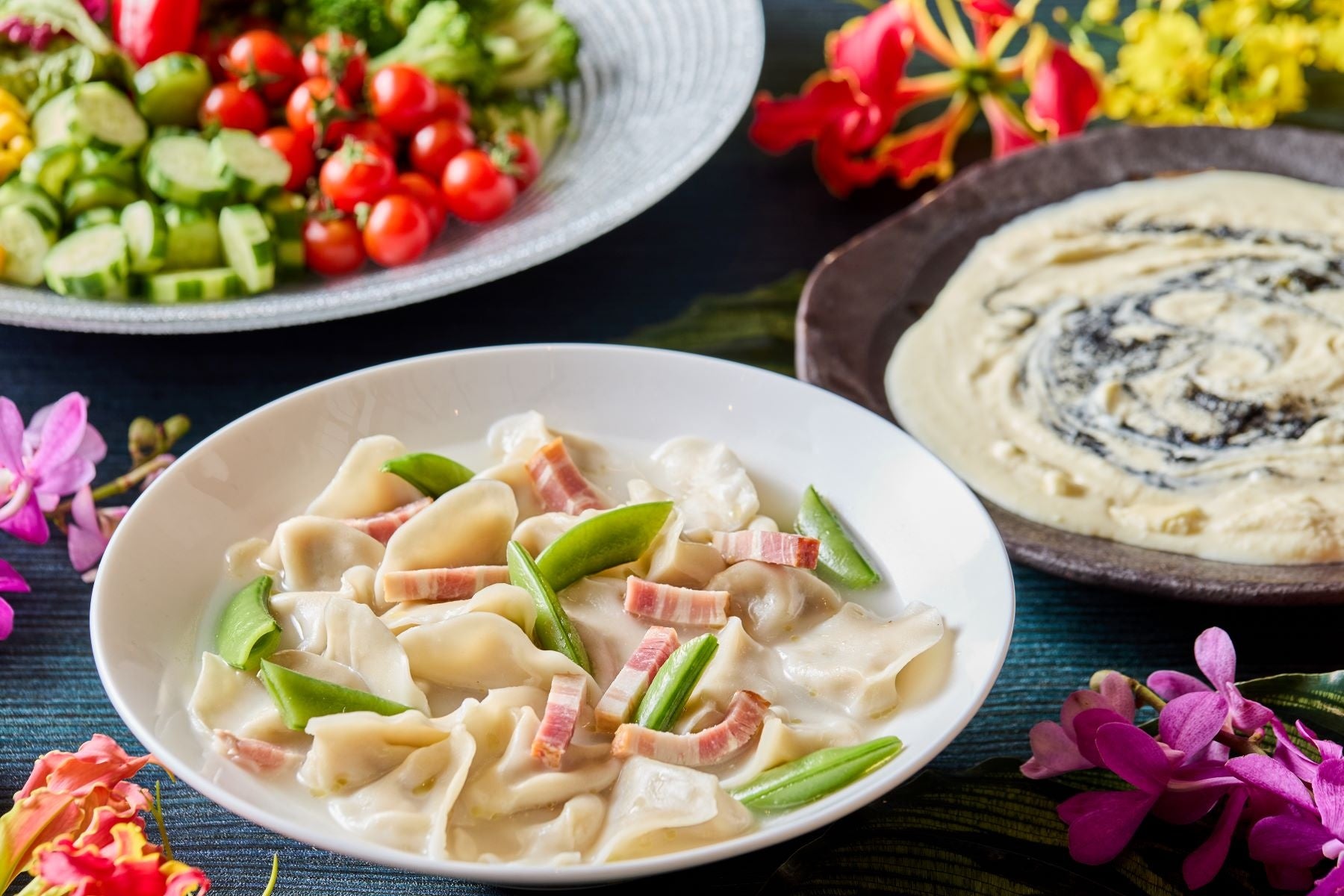 ゴールデンウイークや夏至、梅雨などと重なる初夏の本シーズンは、日本を含む韓国、中国、タイ、ベトナム、フィリピンなどの東アジア地域を中心としたグルメ&パティシエ特製スイーツをラインナップ。特に、シェフズ ライブ キッチン名物のファーストディッシュには、特別感が満ち溢れる“フカヒレ”を使用したスープをご提供。ファーストディッシュの名にふさわしい絶品スープで胃を温めていただいてから、ブッフェを満喫いただきます。