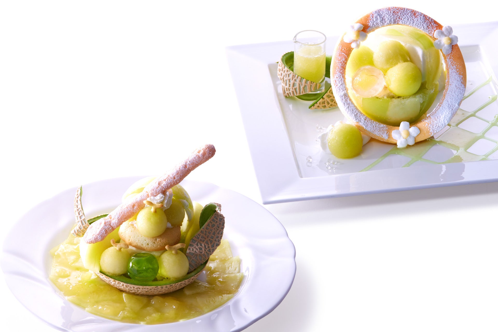プレート一面に敷き詰められた静岡県産のマスクメロン果肉やジャムからは、甘く高貴な香りが際立ちます。器にはメロンババロアとメロンチーズスフレを重ね、ダックワーズと小さなメロンに見立てた果肉を飾っています。