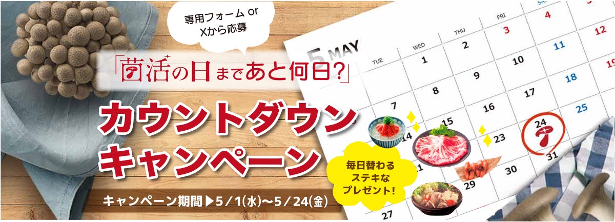 この度、お陰様で今年で9年目を迎える「菌活の日」を記念して、5月1日から、毎年ご好評をいただいている「菌活の日まであと何日?」カウントダウンキャンペーンを実施いたします。