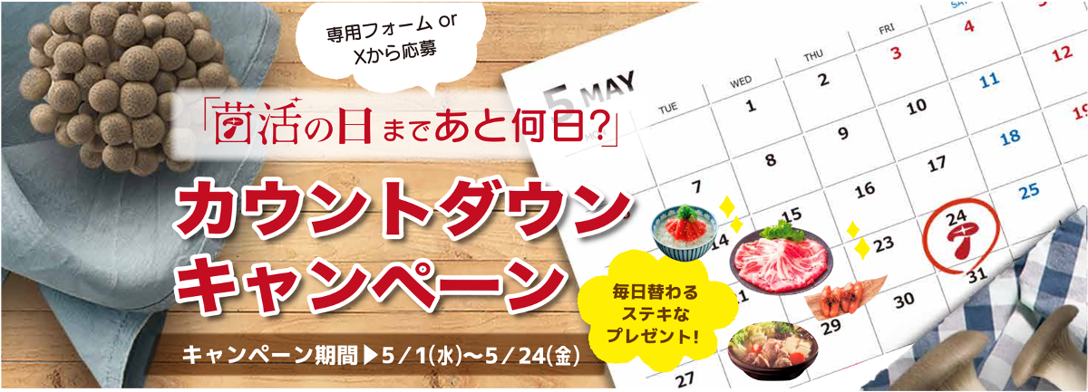 この度、お陰様で今年で9年目を迎える「菌活の日」を記念して、5月1日から、毎年ご好評をいただいている「菌活の日まであと何日?」カウントダウンキャンペーンを実施いたします。