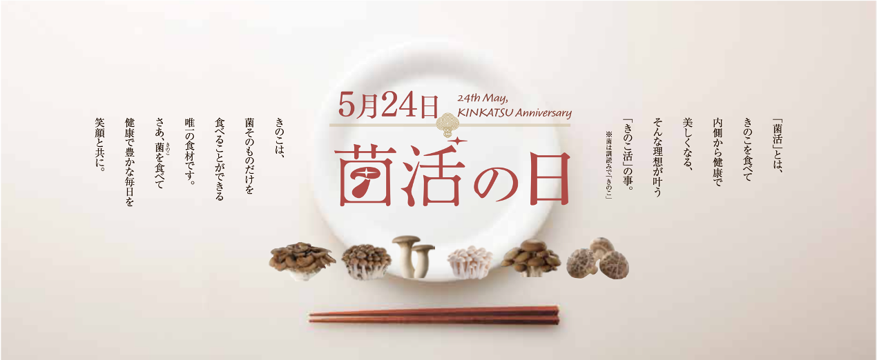 「菌活」とは、きのこを食べて、身体の内側から健康で美しくなる「きのこ活」のことであり、腸活、肌活、筋活、脳活、妊活、眠活、温活、痩せ活などすべての理想を叶える生活習慣です。
