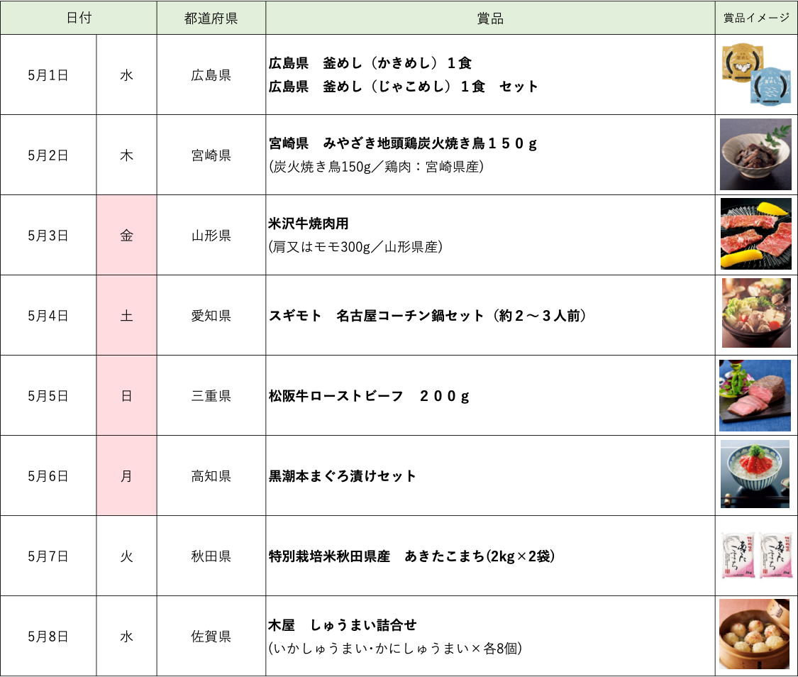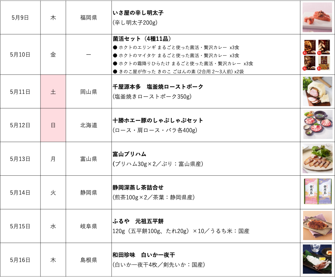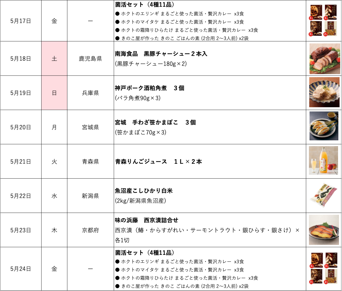 5/1(水)〜5/23(木)まで、毎日抽選で2名様に、以下の全国のご当地名産品やホクト菌活セットが、