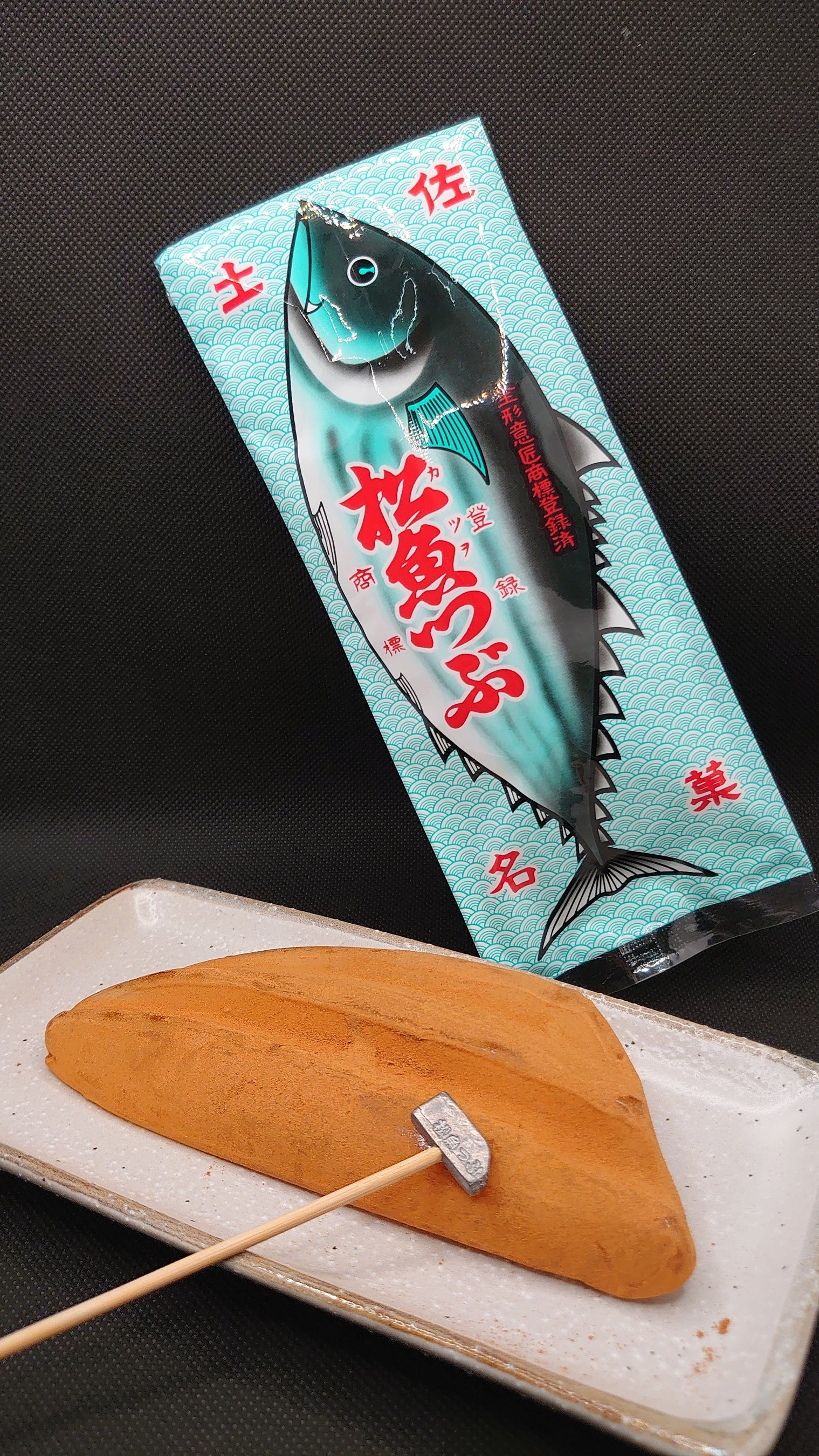 高知県の菓子店「山西金陵堂」の看板菓子で、土佐名物の鰹節の形・色を模したシナモンの飴菓子です。『松魚』はかつおと読み、『つぶ』は土佐の方言で飴を意味します。大きさは15cmほどで、カツオのイラストが施された袋に一緒に入っている小さなトンカチで飴をコンコンと叩いて割って食べます。ニッキの香りが引き立ち、懐かしい気持ちにさせてくれる飴菓子です。