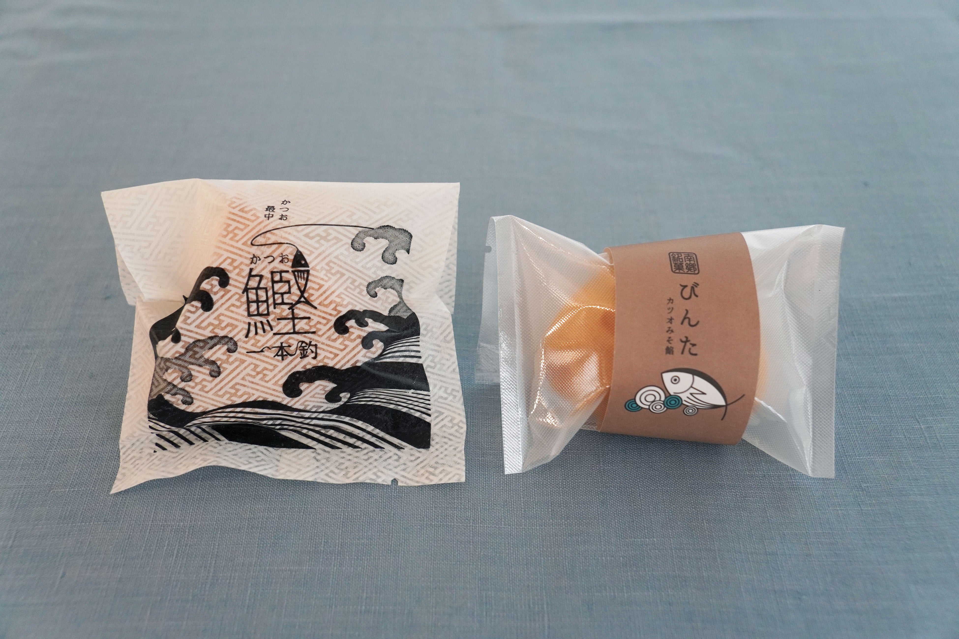 宮崎県日南市の和菓子店「明月堂」で販売しているかつおの頭をモチーフにしたもなか「鰹一本釣」。宮崎県が「かつお一本釣りの漁獲量日本一」であることをPRするために考案されました。白あんにはカツオが入った「かつおみそ」や日南産レモンを練り込み、甘みと塩加減、酸味の絶妙なバランスが特徴です。※びんたにはレモンを使用していません。