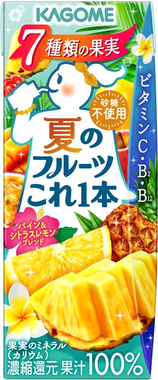 「夏のフルーツこれ一本 パイン&シトラスレモンブレンド」は、パインやシトラスレモン等の7種類の果実をブレンドした夏限定の100%果実ミックスジュースです。夏にぴったりの爽やかな味わいで、シトラスレモンのほどよい香りを楽しむことができます。また、たっぷりビタミンC・B2・B12や果実のミネラル(カリウム)を摂ることができます。