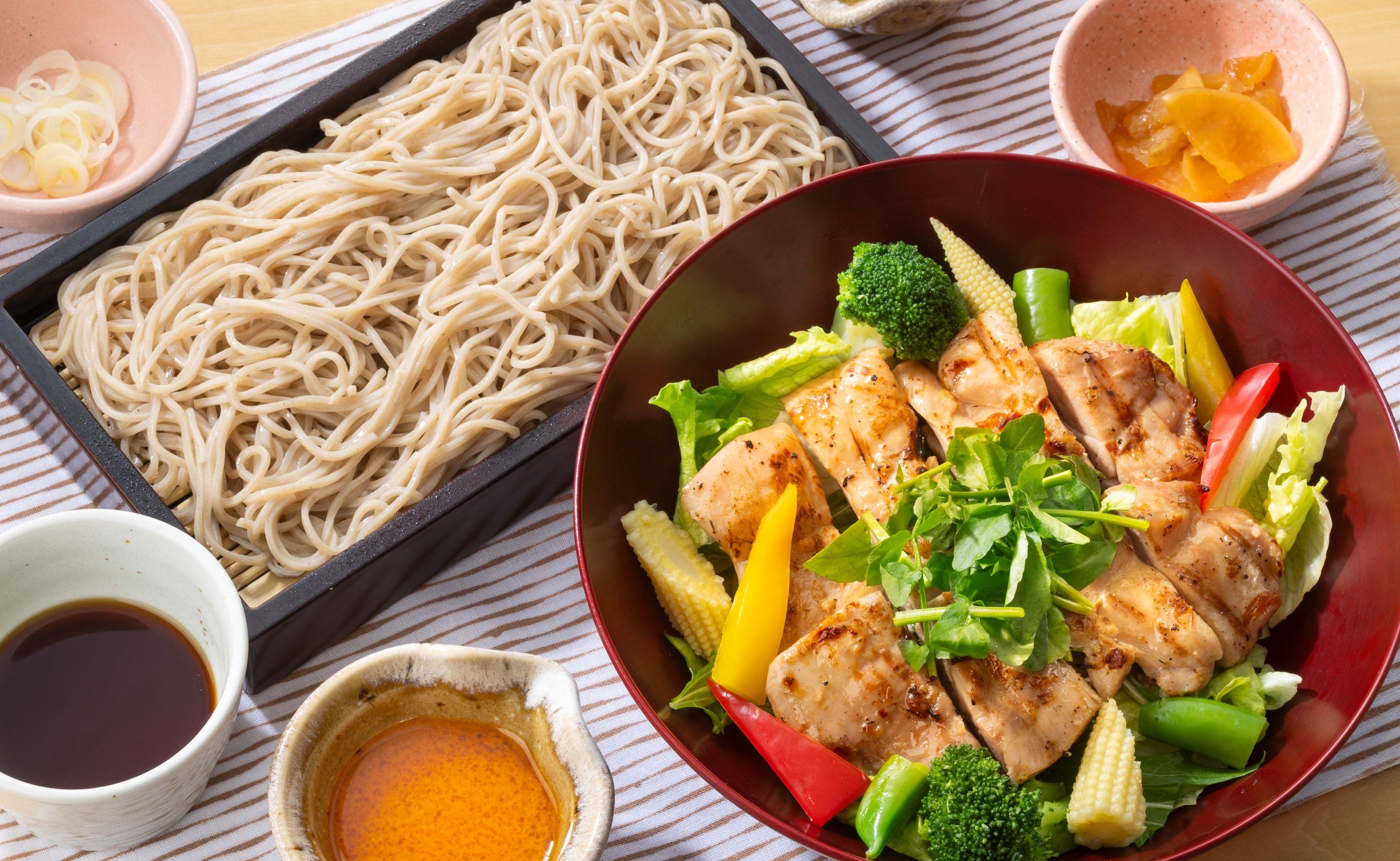 鶏もも塩麴焼きの彩りサラダとお蕎麦
