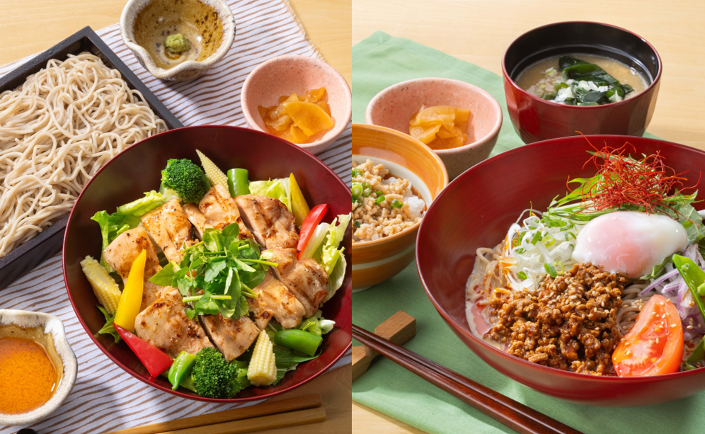 大戸屋は、“日本一の筋トレコンビYoutuber”のまめたまさん全面協力のもと、ダイエットやトレーニングをサポートする、低GI食品の蕎麦をつかった「筋トレ定食」2商品を共同開発しました。柔らかジューシーな鶏ももの塩麴焼きと、風味豊かな蕎麦が一緒に楽しめる『鶏もも塩麴焼きの彩りサラダとお蕎麦』(価格:1,380円 税込)と、ピリ辛な豆乳胡麻ダレが食欲をそそる『ピリ辛豆乳胡麻ダレの冷やし坦々蕎麦と鶏そぼろご飯』(価格:1,380円 税込※温玉あり)です。