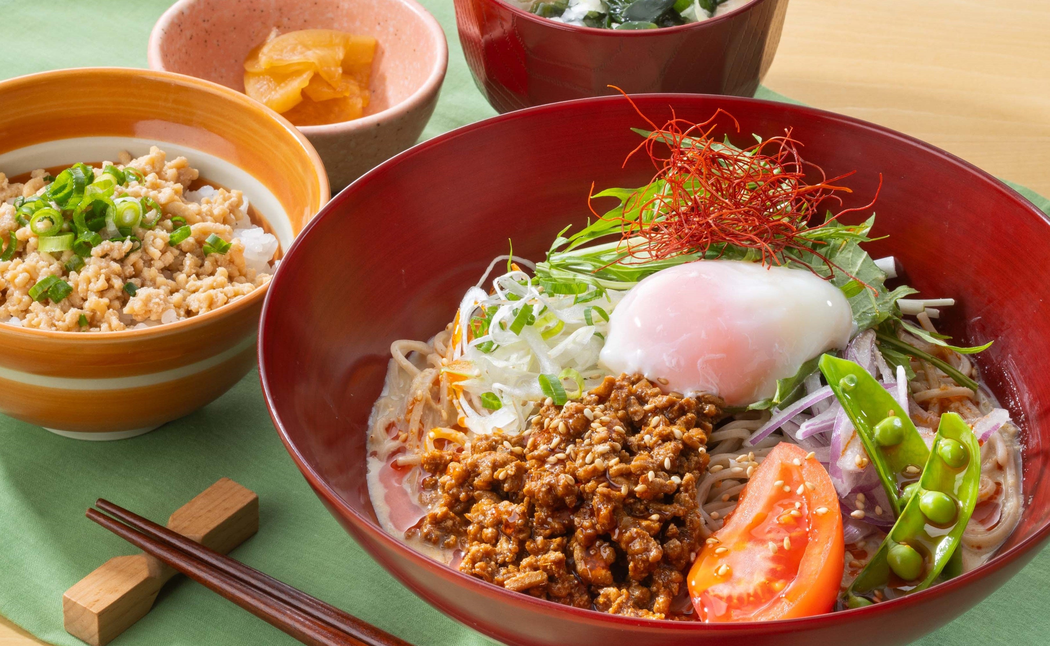 豆乳のまろやかさと胡麻の風味が、辛さをやわらげながらも深みを加える、ピリ辛豆乳胡麻ダレがたまらない絶品の冷やし坦々蕎麦です。特製の豆乳胡麻ダレは鶏そぼろご飯との相性もバツグン。是非、温泉玉子をのせてお召し上がりください。